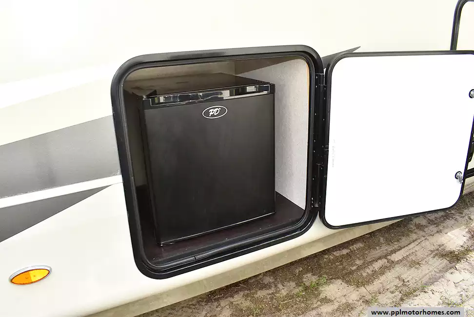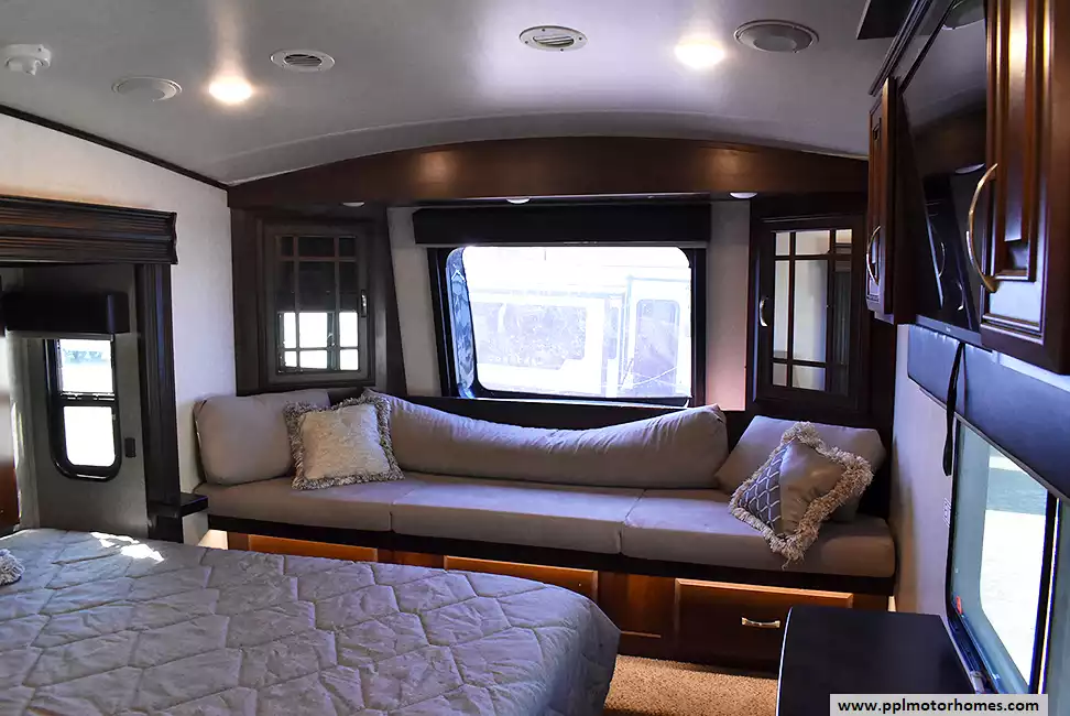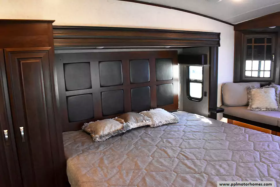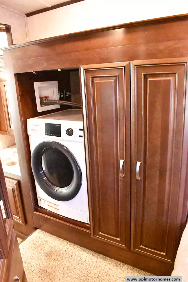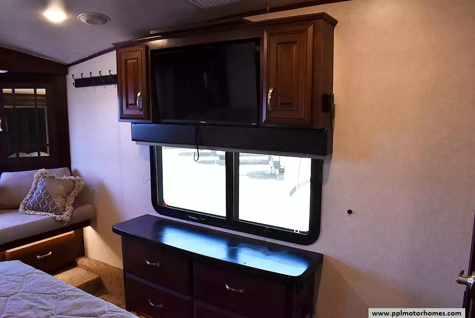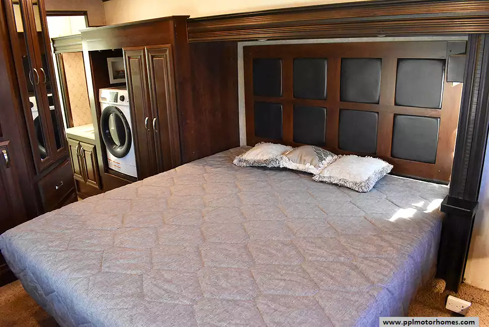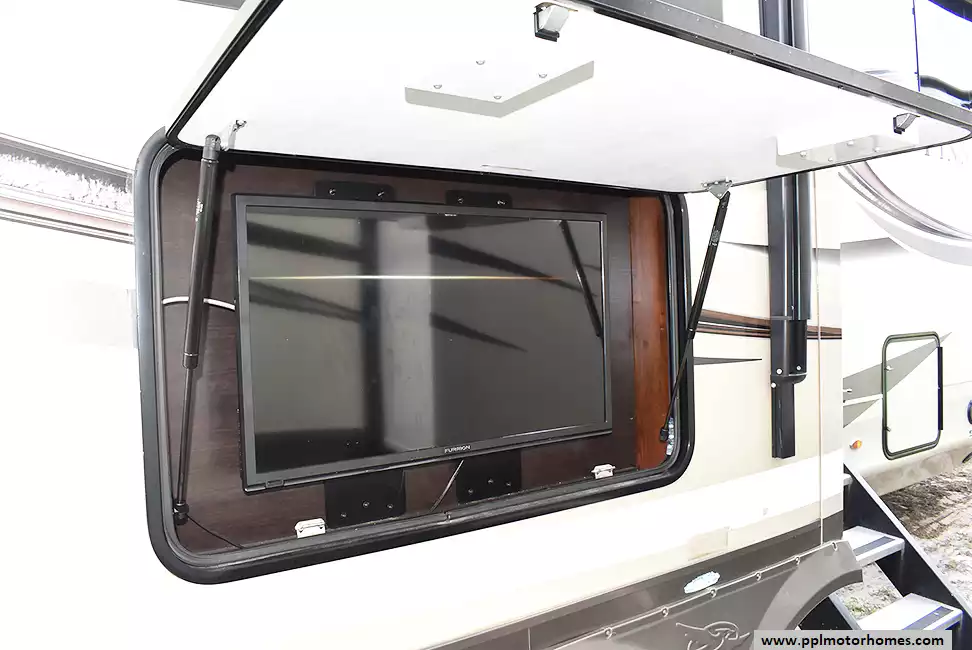 Feature-Packed Fifth Wheel with Comfort and ConvenienceThis well-maintained fifth wheel offers outdoor entertainment and an additional refrigerator perfect for extended stays. The kitchen includes a center island,and ample storage throughout. In the primary bedroom, you'll find a cozy daybed near the window and a washer/dryer combo for added convenience on the road.
