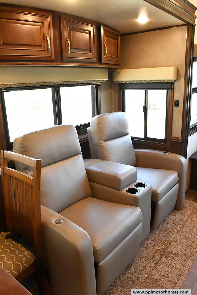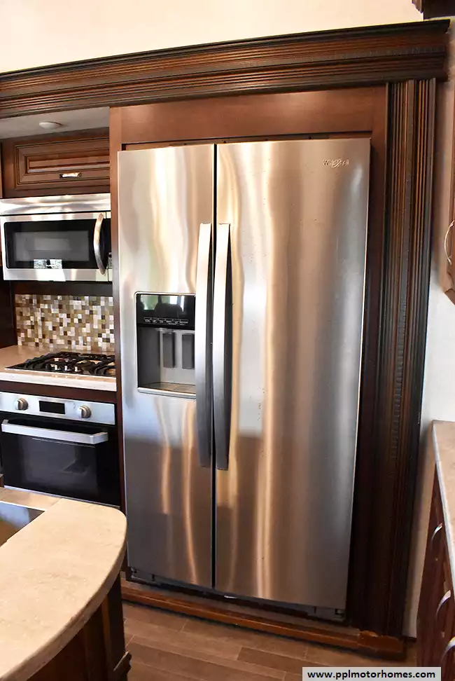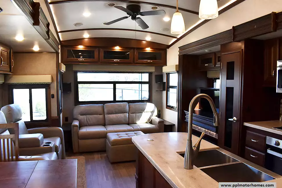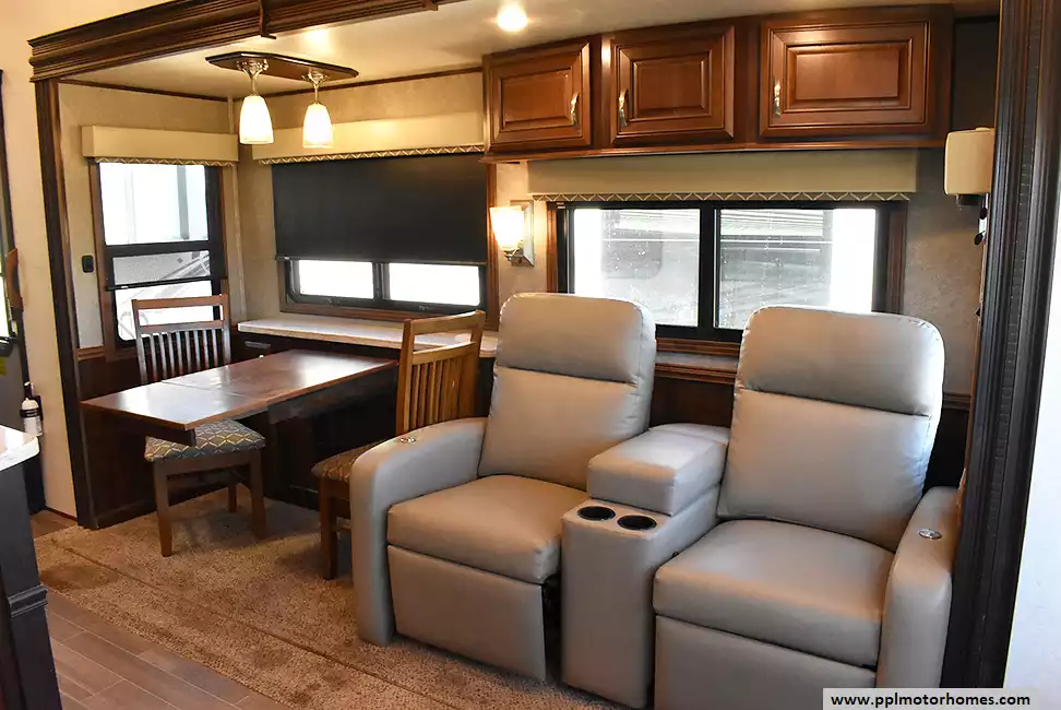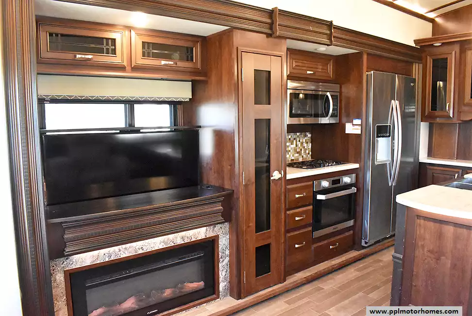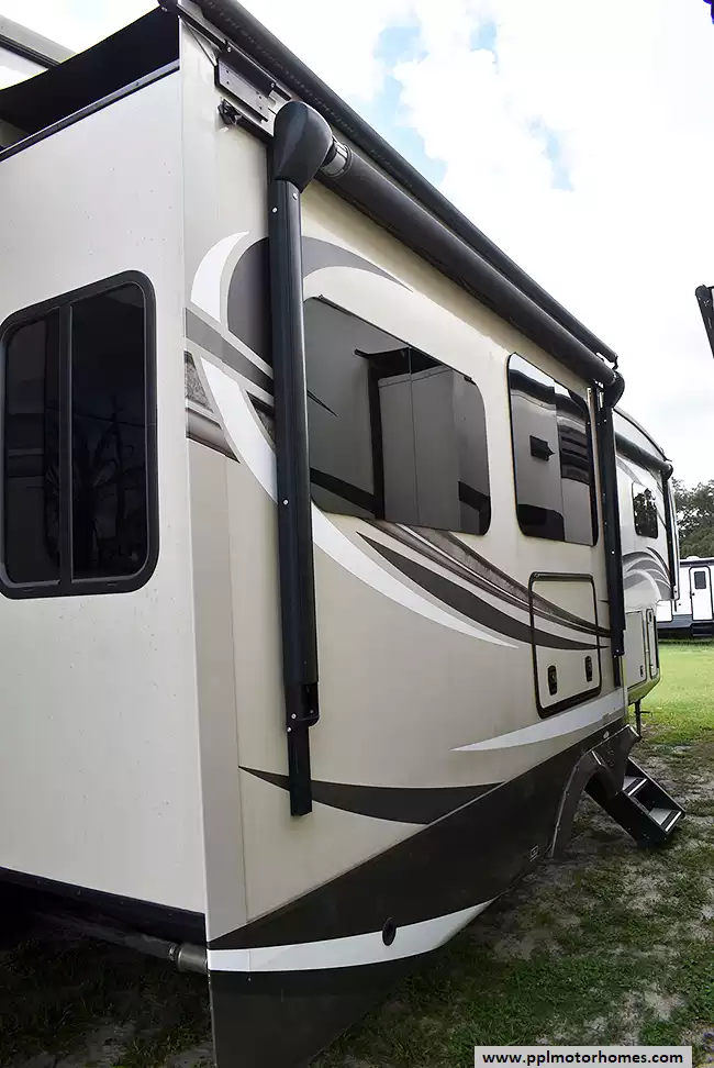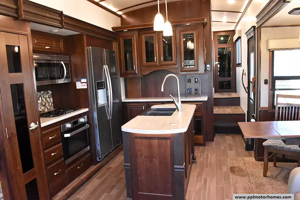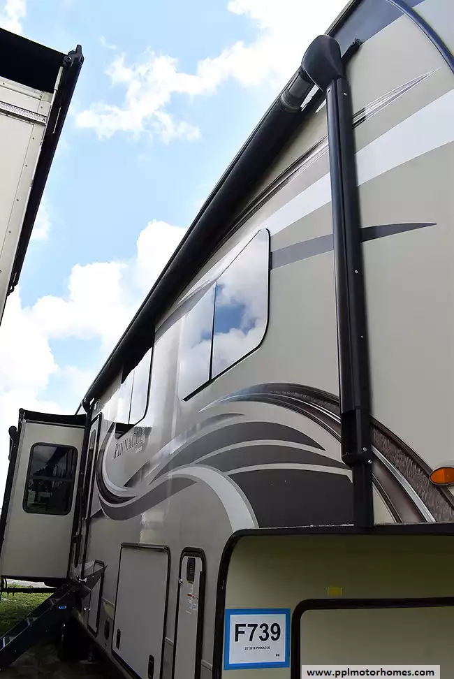 This 2018 Pinnacle 37RLWS has a Hydraulic Landing Gear, 3 Slide-outs, 2 Ducted Air Conditioners, Double Door Residential Whirlpool Refrigerator (Additional Refrigerator Present), In-Fridge Ice Maker, Automatic Main Awning, Washer/Dryer, Outside Entertainment System, 3 TVs, Outside Shower, Fireplace, Central Vacuum, Microwave, 3 Burner Range, Oven