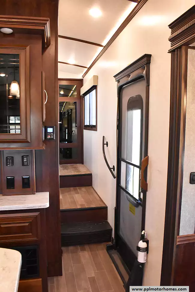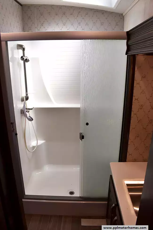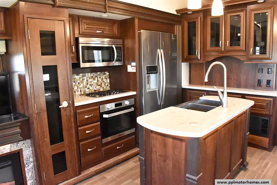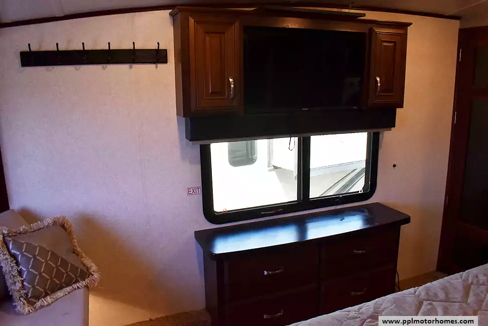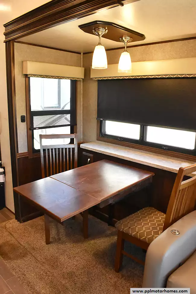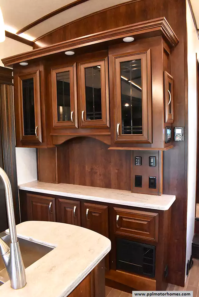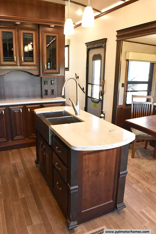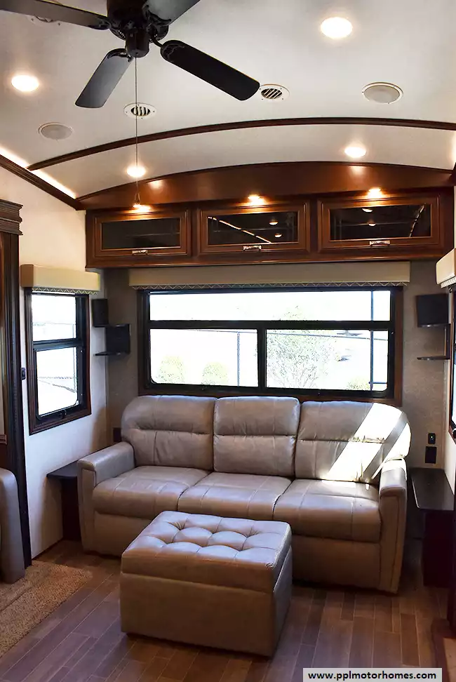 This 2018 Pinnacle 37RLWS has a Hydraulic Landing Gear, 3 Slide-outs, 2 Ducted Air Conditioners, Double Door Residential Whirlpool Refrigerator (Additional Refrigerator Present), In-Fridge Ice Maker, Automatic Main Awning, Washer/Dryer, Outside Entertainment System, 3 TVs, Outside Shower, Fireplace, Central Vacuum, Microwave, 3 Burner Range, Oven