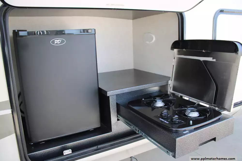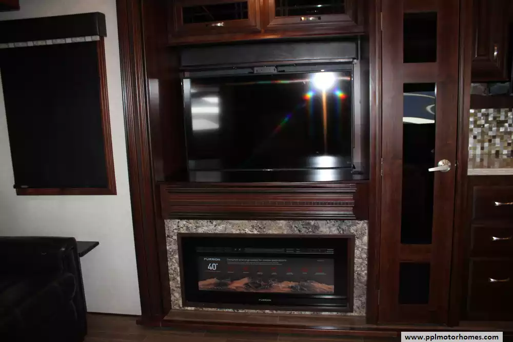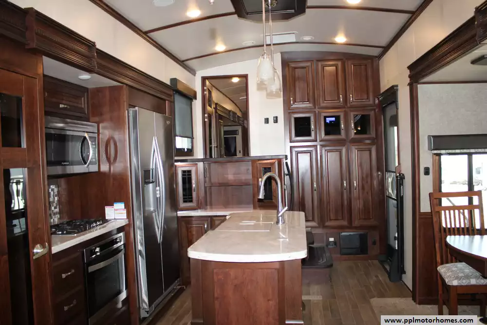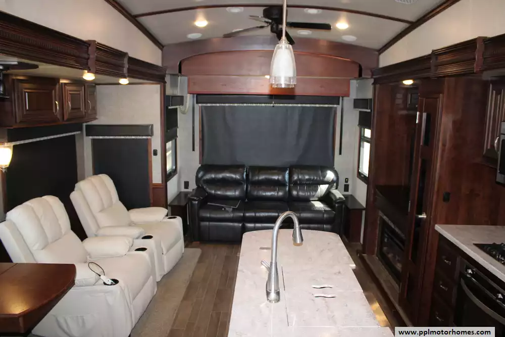 The 2018 Jayco Pinnacle 37RSTS is a luxury fifth-wheel RV designed for extended stays and full-time comfort, offering a spacious triple-slide layout that stretches just over 42 feet in length. Built with aluminum framing and fiberglass sidewalls, it features high-end residential touches such as a rear living area with theater seating, sofa, entertainment center with fireplace, and a fully equipped kitchen with solid-surface countertops, a three-burner stove, convection microwave, and full-size refrigerator. The front master suite includes a king-size bed, large wardrobe, and stacked washer/dryer, while a central bathroom provides a roomy shower and porcelain toilet. With a 75-gallon fresh water capacity, 87-gallon gray tank, 50-gallon black tank, 15,000 BTU air conditioning, and 40,000 BTU furnace, it is built for comfort in a variety of climates.