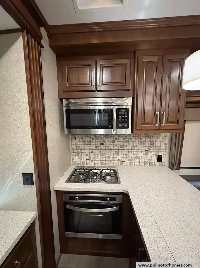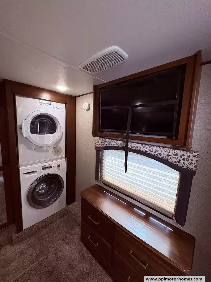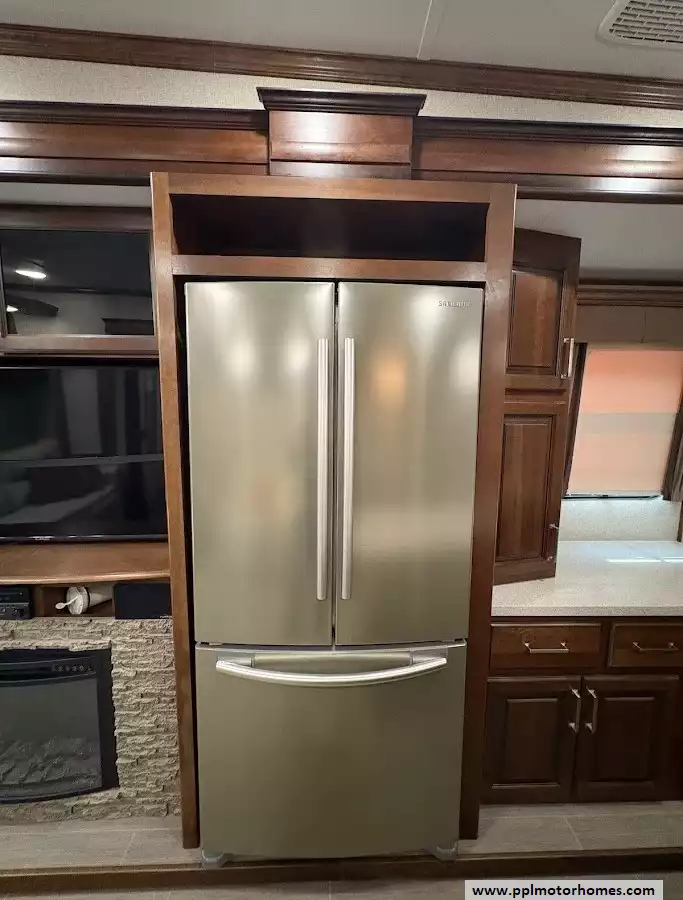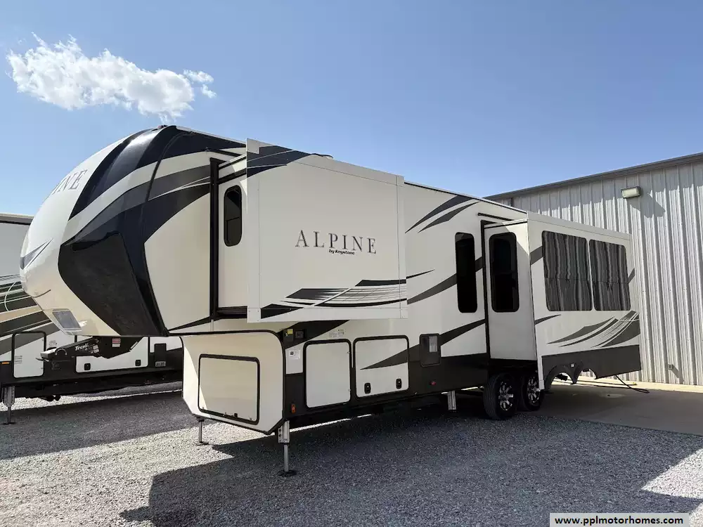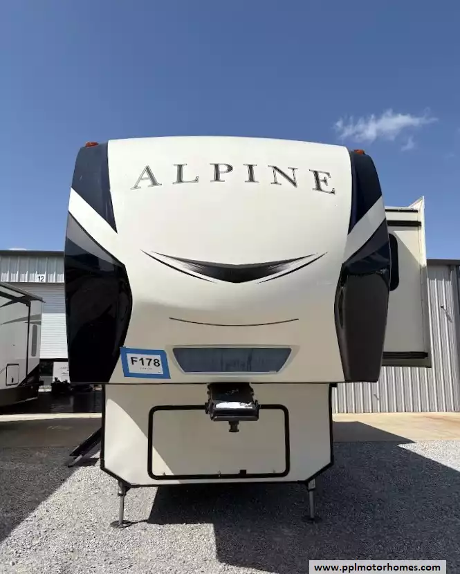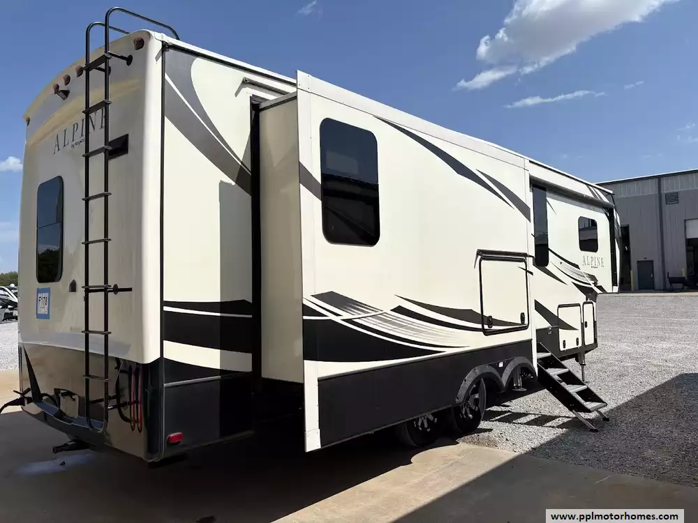 This 2018 Alpine 3301GR sleeps up to 4 people, has a Hydraulic Landing Gear, 3 Slide-outs, 2 Ducted Air Conditioners, 4 Door Residential Samsung Refrigerator, In-Fridge Ice Maker, Automatic Main Awning, Washer/Dryer, Dishwasher, Outside Entertainment System, 3 TVs, Central Vacuum, Convection Microwave, 3 Burner Range, Oven