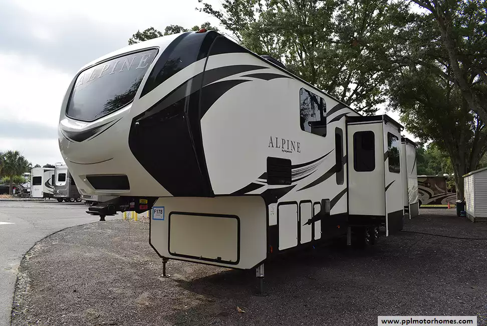This 2018 Alpine 3800FK has a Hydraulic Landing Gear, 5 Slide-outs, 2 Ducted Air Conditioners, 4 Door Gas/12v Norcold Refrigerator, Automatic Main Awning And Slide Awning, Washer/Dryer, Satellite Receiver, Outside Stereo, 2 TVs, DVD Player, Outside Shower, Fireplace, Central Vacuum, Convection Microwave, 3 Burner Range, Oven