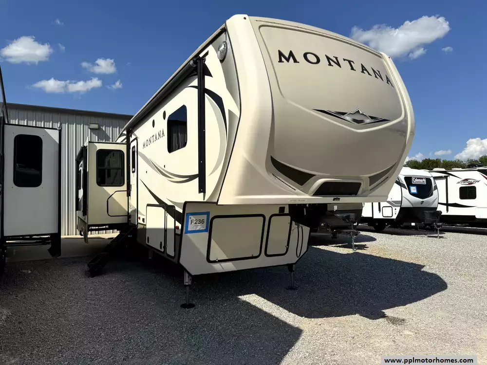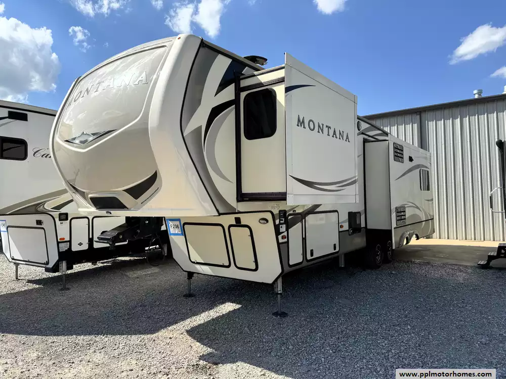 This 2018 Montana by Keystone 3130RE FW has a Hydraulic Landing Gear, 3 Slide-outs, 2 Ducted Air Conditioners, 4 Door Side by Side Gas/110v Norcold Refrigerator, Automatic Main Awning, Washer/Dryer Connections, Outside Speakers, 2 TVs, Outside Shower, Fireplace, Central Vacuum, Microwave, 3 Burner Range, Oven