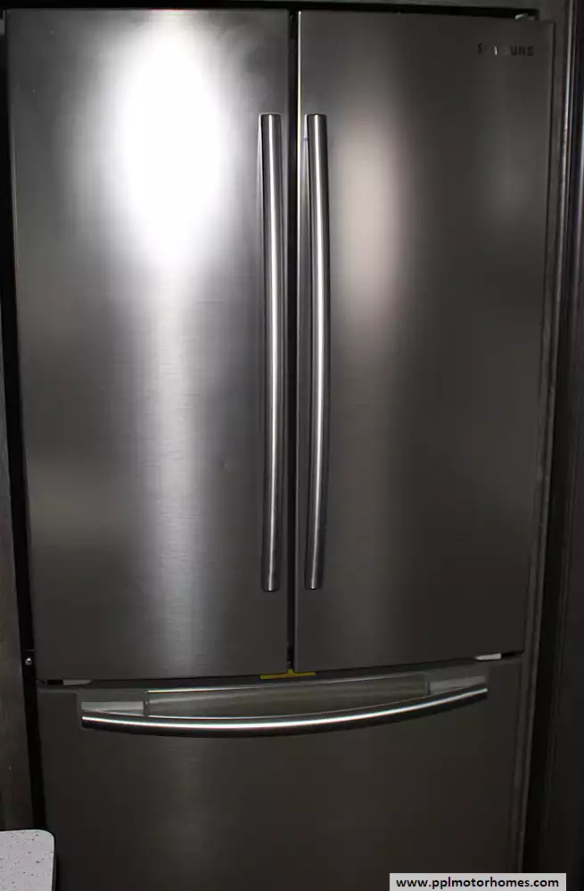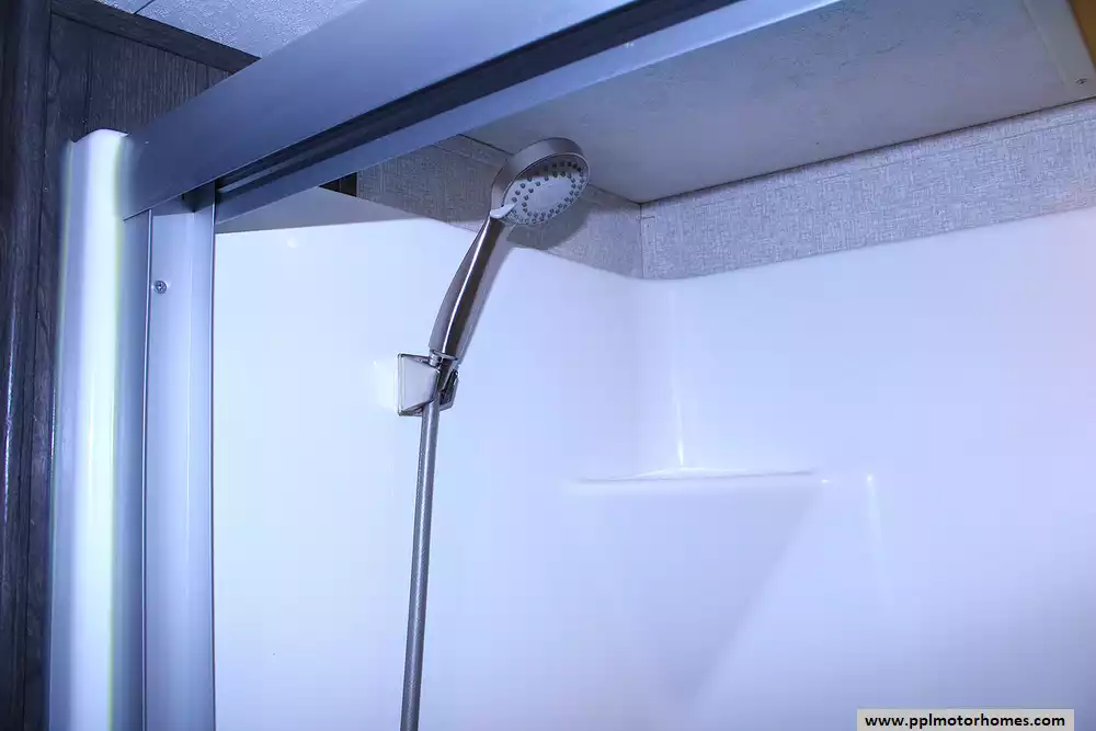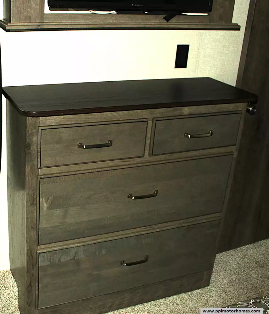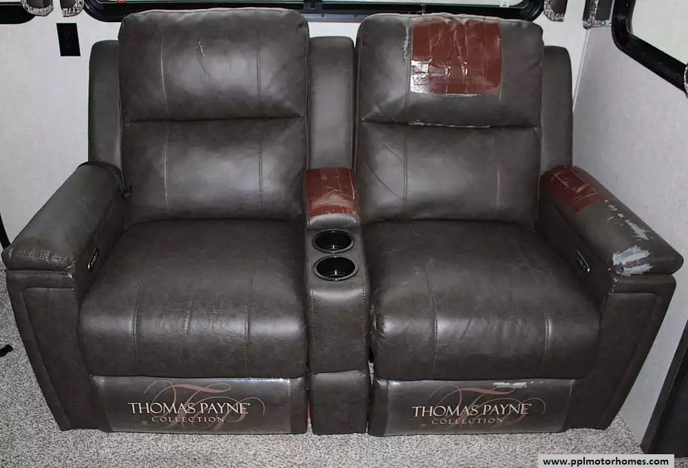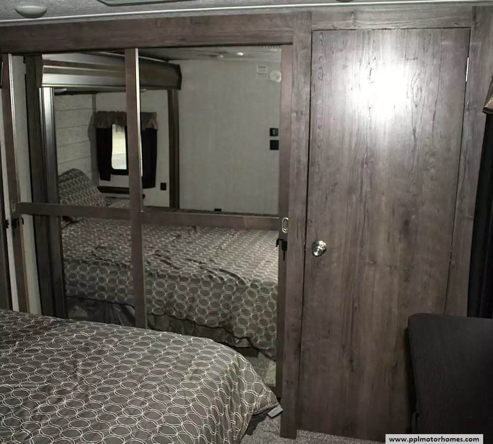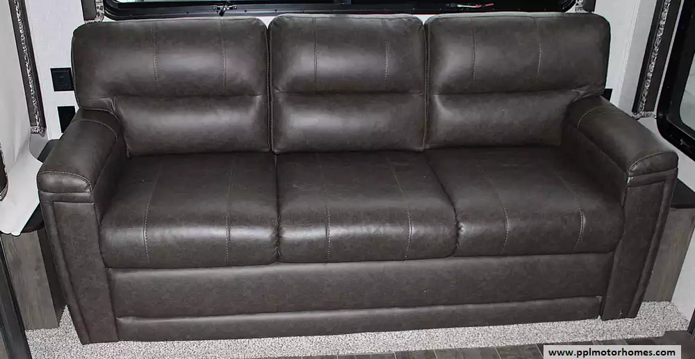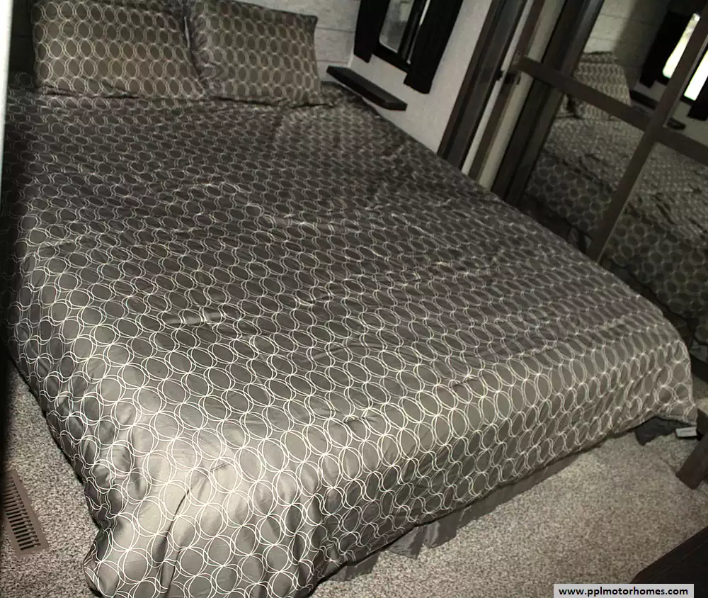 This model can sleep 4 - 6 people, with a private front master bedroom featuring a queen bed and generous storage, plus additional sleeping accommodations in the living area via a convertible sofa or seating. The large bathroom and well-separated living spaces make it ideal for couples, snowbirds, or small families seeking comfort and privacy on the road.