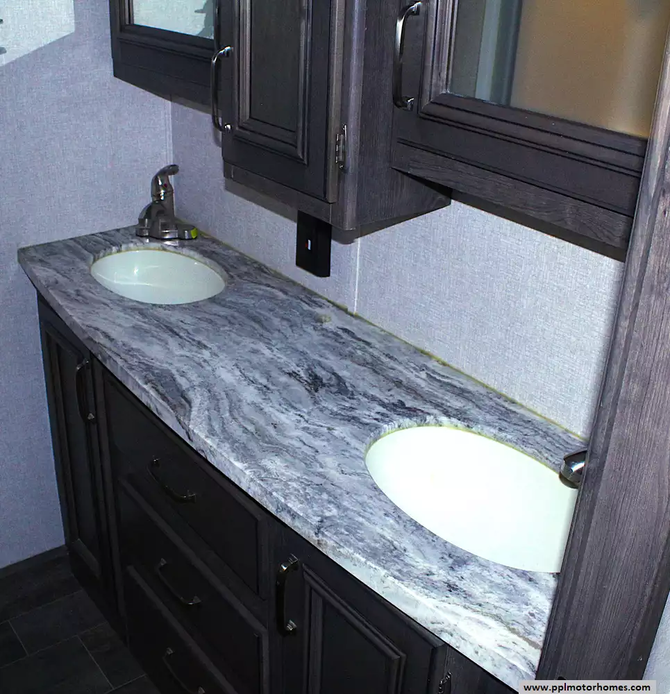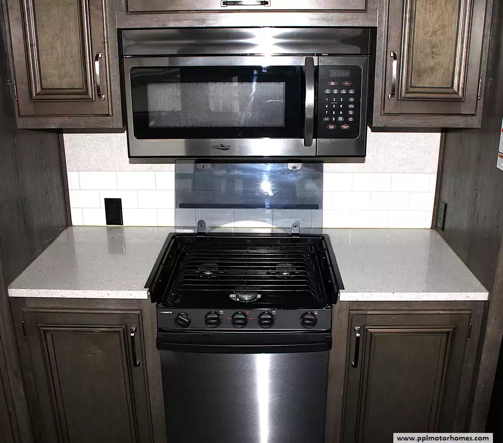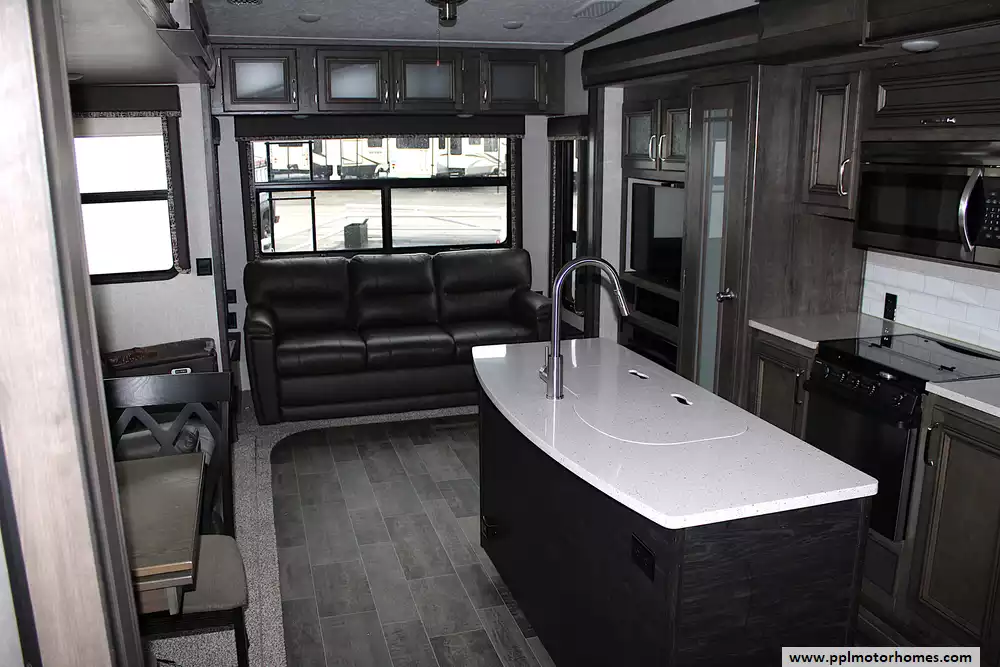 2018 Keystone Montana High Country 331RL is a well-appointed fifth wheel designed for extended stays and comfortable full-time use. The rear living floorplan offers a spacious lounge with opposing slides, theater seating or sofa, an entertainment center, and large panoramic windows. The central kitchen provides solid-surface countertops, ample cabinetry, and residential-style appliances, delivering both functionality and a premium feel.