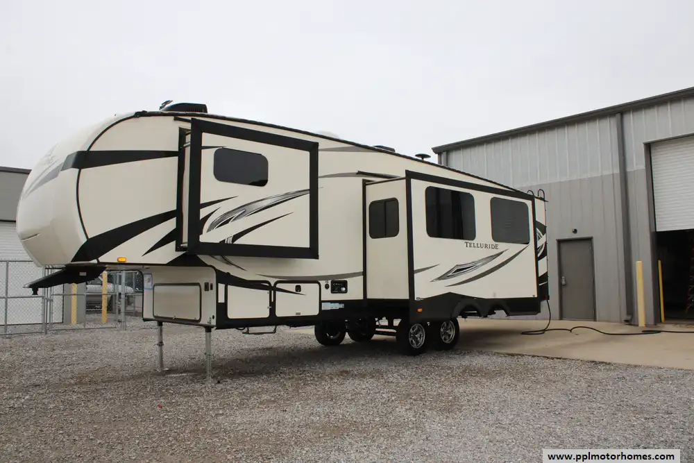This 2018 Telluride M-296BHS has an Electric Landing Gear, 2 Slide-outs, 1 Non-Ducted And 1 Ducted Air Conditioner, Double Door Gas/110v Dometic Refrigerator, Automatic Main Awning, Outside Speakers, TV, Outdoor Kitchen, Outside Shower, Fireplace, Microwave, 3 Burner Range