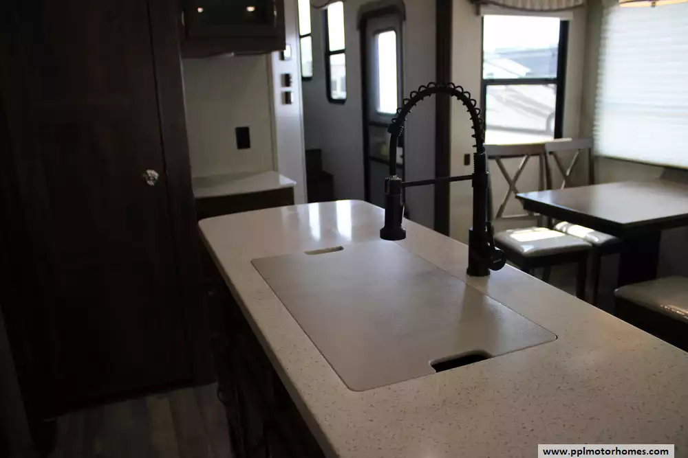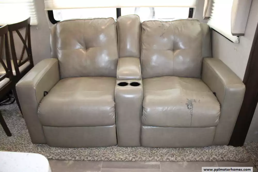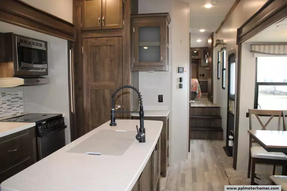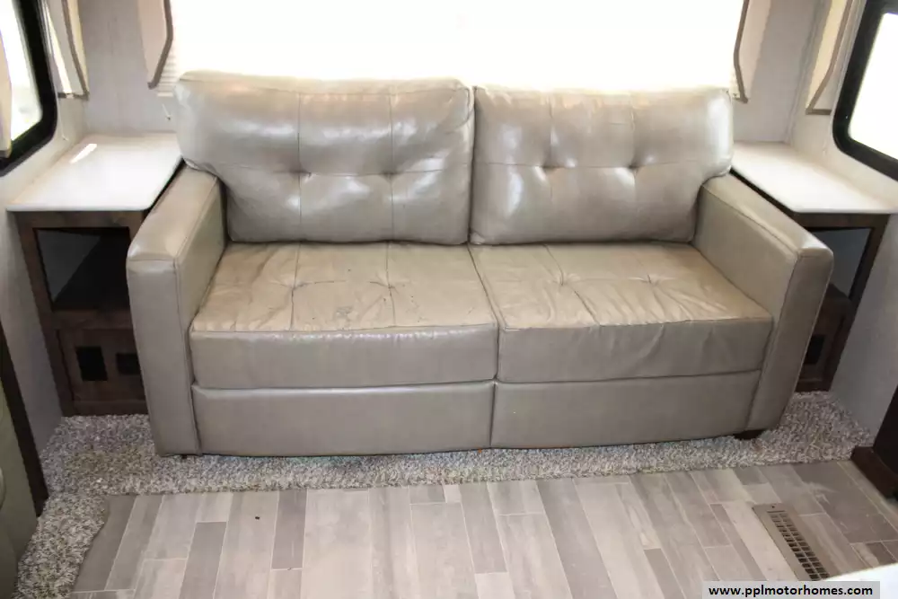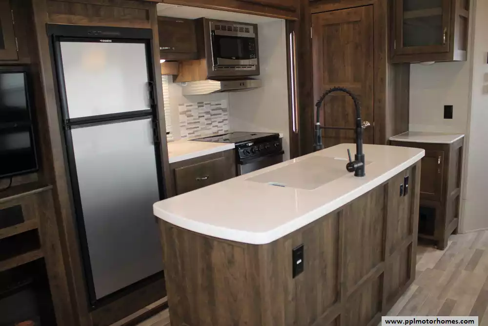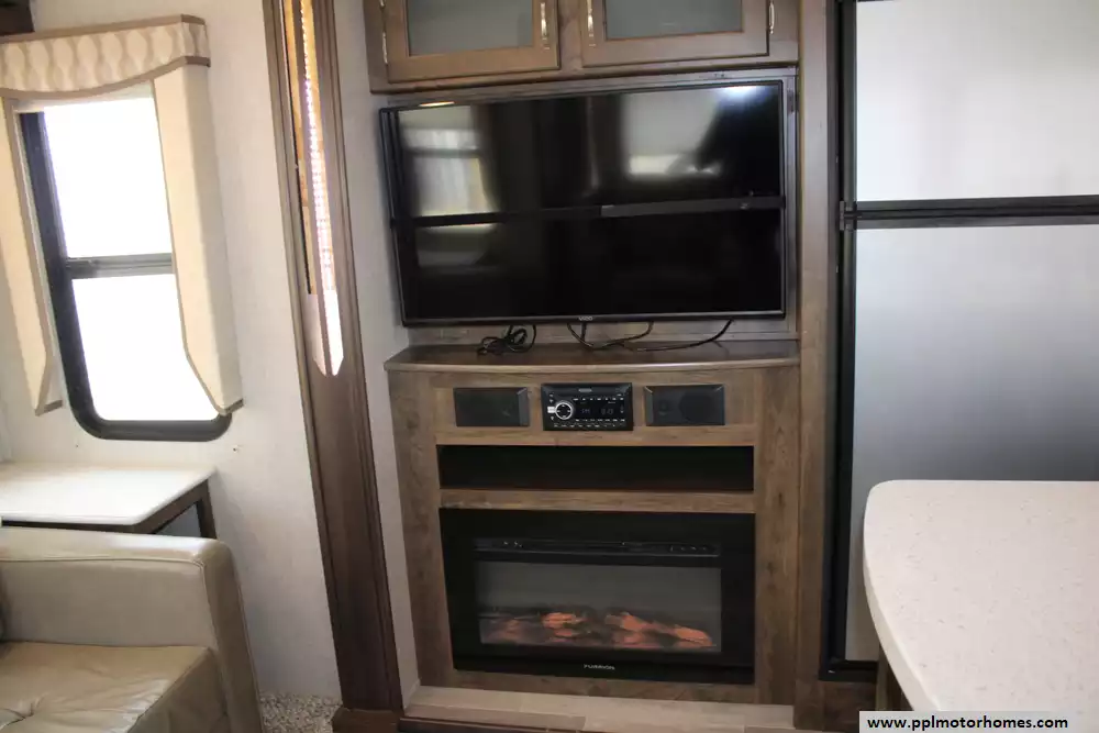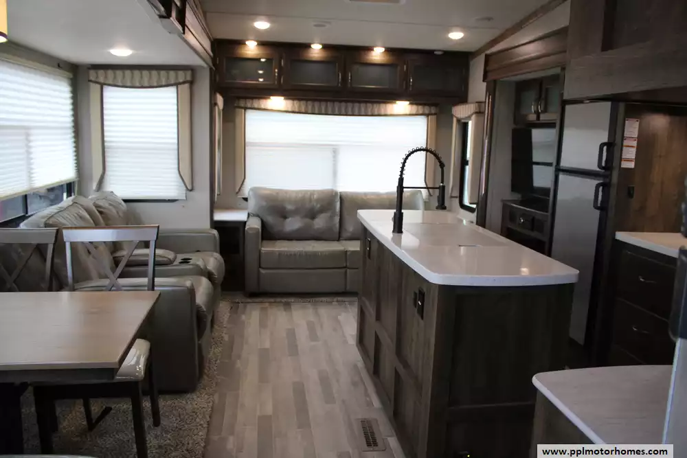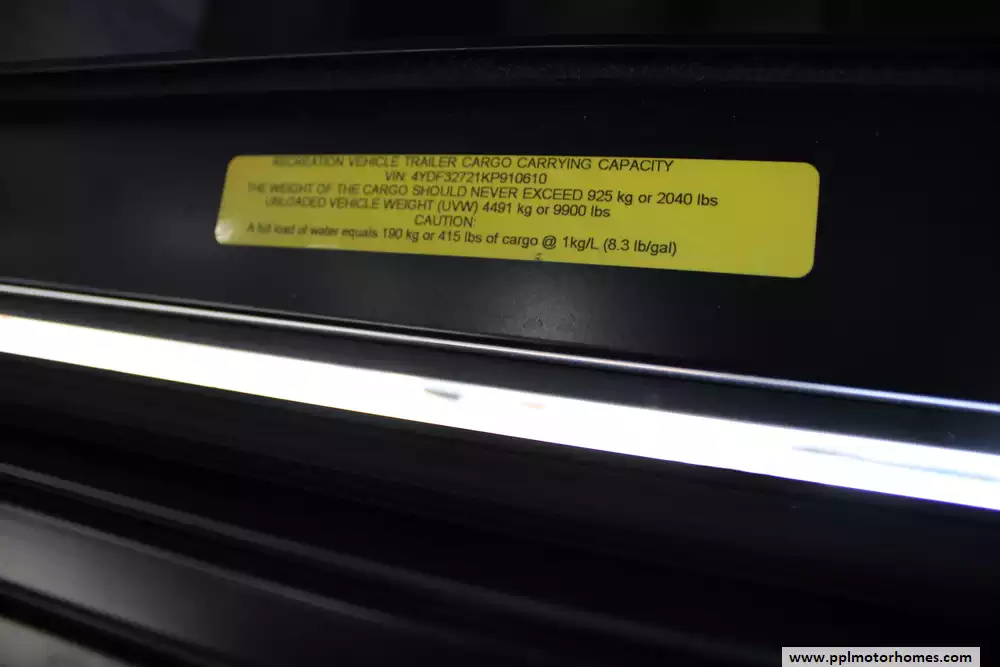 The 2019 Dutchmen Astoria 3273MBF is a feature-packed, mid-profile fifth wheel spanning approximately 36.5 ft and weighing in at around 9,934 lb dry, with a hitch weight near 1,592 lb. Built around a versatile midship bunkhouse floorplan, it offers sleeping for up to eight, complete with two bunks in a dedicated kids' space, a front queen suite, and a convertible sofa and dinette . Interior highlights include four power slide-outs, a central kitchen island with stainless appliances and solid-surface counters, theater seating facing a glass-front fireplace, and a dual-entry bath for added convenience.