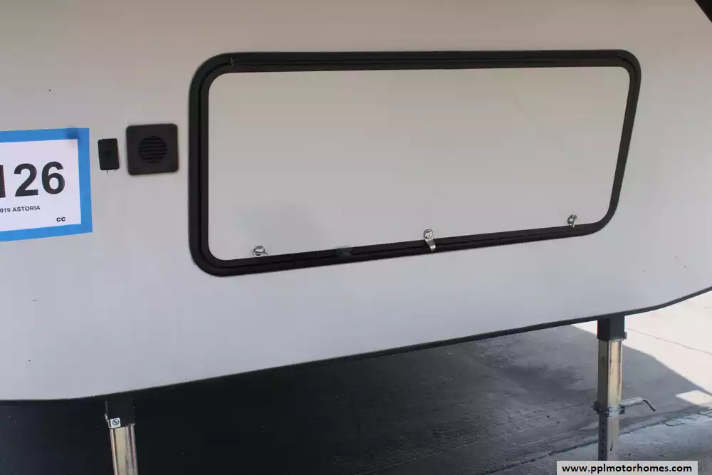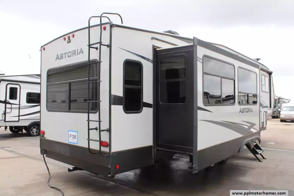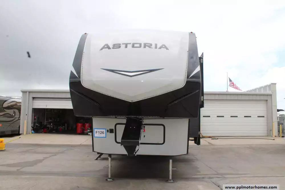 Fully equipped with residential amenities, such as a 35,000 BTU furnace, 15k BTU ducted A/C, 6-gal gas/electric water heater, LED lighting, and centralized utility panel, it wraps up with exterior perks like power leveling jacks, rear accessory hitch, power awning with LED accent lighting, outdoor speakers, backup camera prep, and solar prep. Altogether, the Astoria 3273MBF delivers a balanced blend of luxury, family-friendly layout, and value-driven construction, ideal for full-time living or extended travels. This model also includes a brand-new roof. Enjoy making memories in this family-friendly Astoria.
