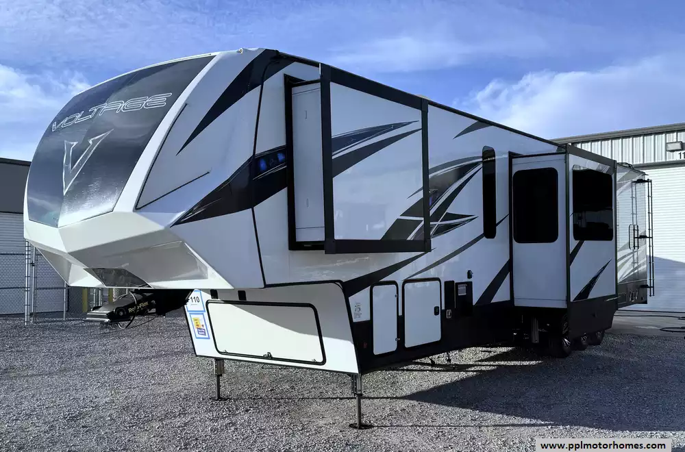 This 2019 Voltage 4185 has a Hydraulic Landing Gear, 3 Slide-outs, Onan Propane Generator, 3 Ducted Air Conditioners, 4 Door Side by Side Gas/110v/12v Norcold Refrigerator, Automatic Main Awning And Window/Door Awnings, Washer/Dryer Connections, Heated Tanks, Outside Entertainment System, 3 TVs, DVD Player, Outside Shower, Fireplace, Central Vacuum, Convection Microwave, 3 Burner Range, Oven