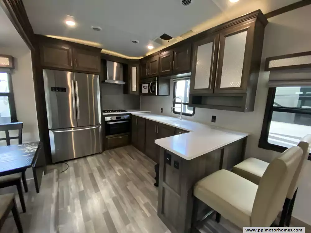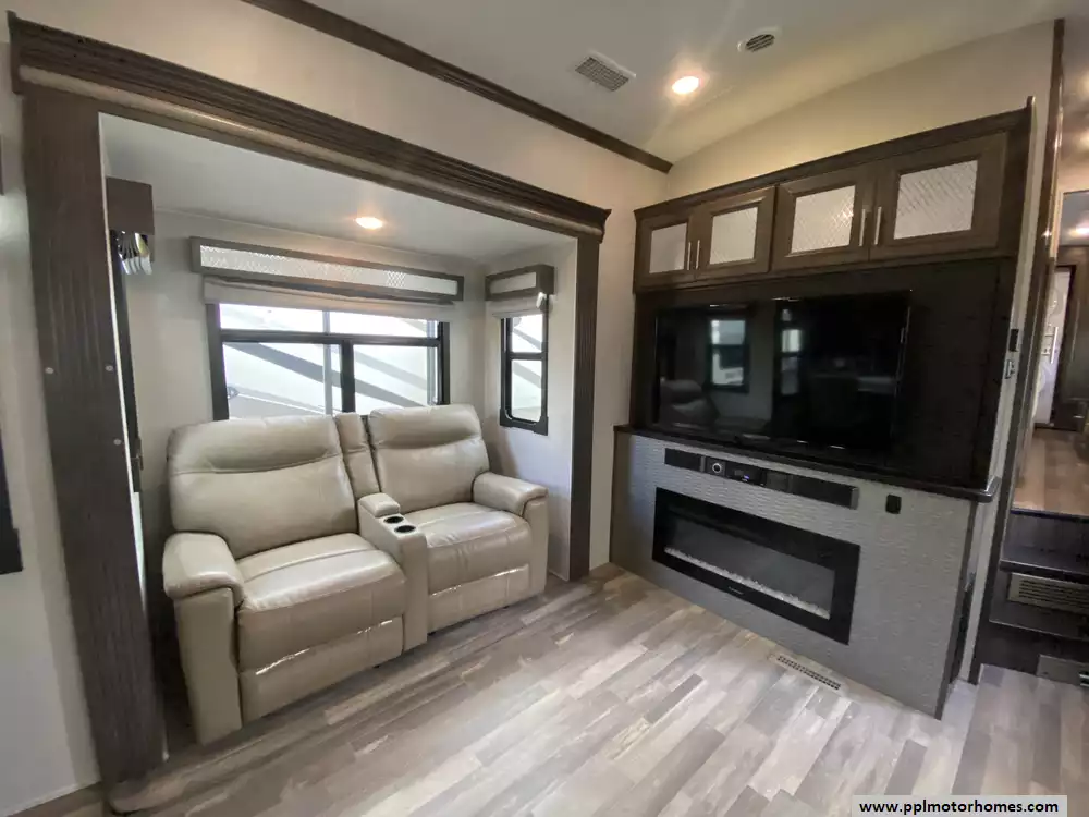 This 2019 Cardinal 3750BKX has a Hydraulic Landing Gear, 4 Slide-outs, 3 Ducted Air Conditioners, Residential Hisense Refrigerator, Automatic Main Awning, Washer/Dryer, Heated Tanks, Outside Speakers, 2 TVs, Fireplace, Central Vacuum, Microwave, 3 Burner Range, Oven