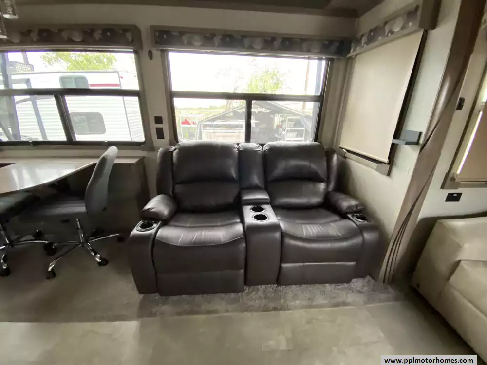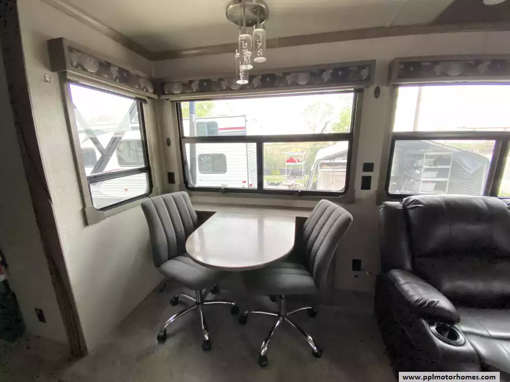 This 2019 Cedar Creek Champagne 38EL has Hydraulic Landing Gear, 3 Slide-outs, 2 Ducted Air Conditioners, Side by Side 110v Residential Insignia Refrigerator, In-Fridge Ice Maker, Automatic Main Awning And Window/Slide Awnings, Washer/Dryer Connections, Outside Entertainment System, 2 TVs, DVD Player, Outside Shower, Fireplace, Central Vacuum, Microwave, 3 Burner Range, Oven. Well maintained Fifth Wheel.