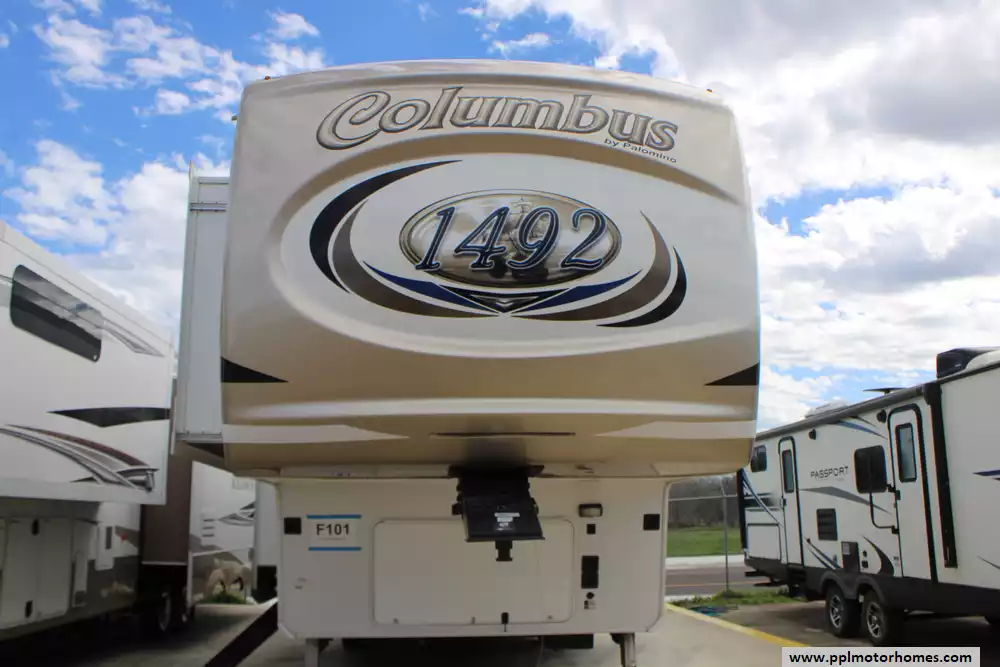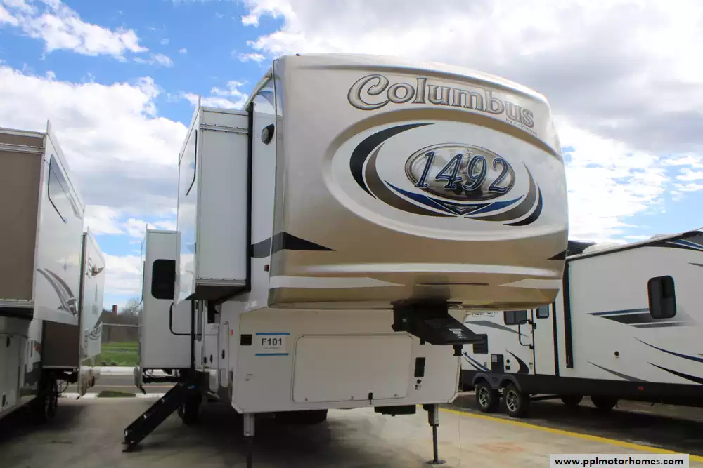 This 2019 Columbus 1492 386FK has a Hydraulic Landing Gear, 4 Slide-outs, 2 Ducted Air Conditioners, Residential Lg Refrigerator, In-Fridge Ice Maker, Automatic Main Awning, Washer/Dryer, Dishwasher, Outside Speakers, TV, DVD Player, Outside Shower, Fireplace, Central Vacuum, Convection Microwave, 3 Burner Range