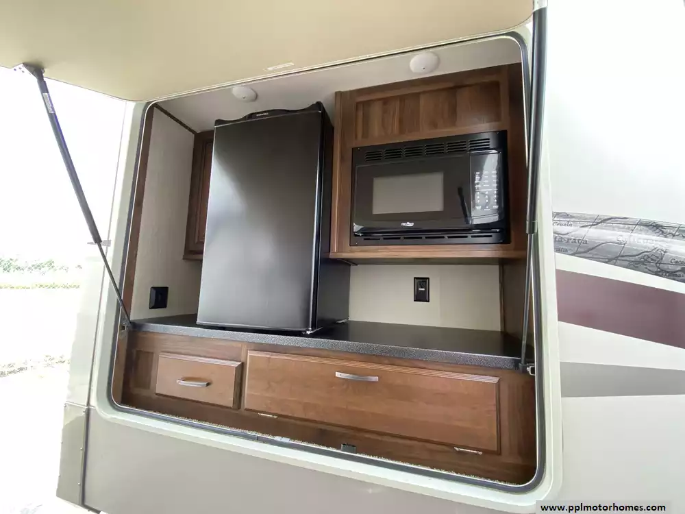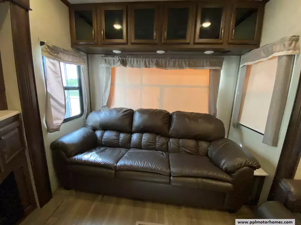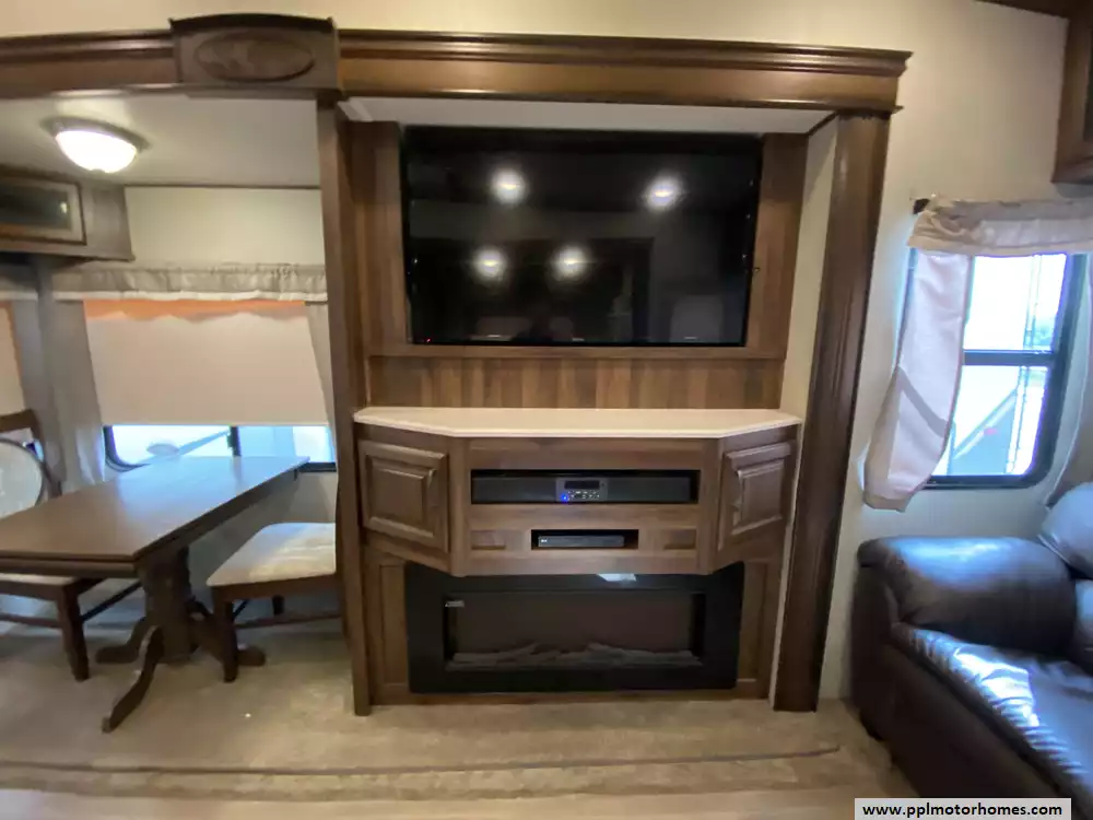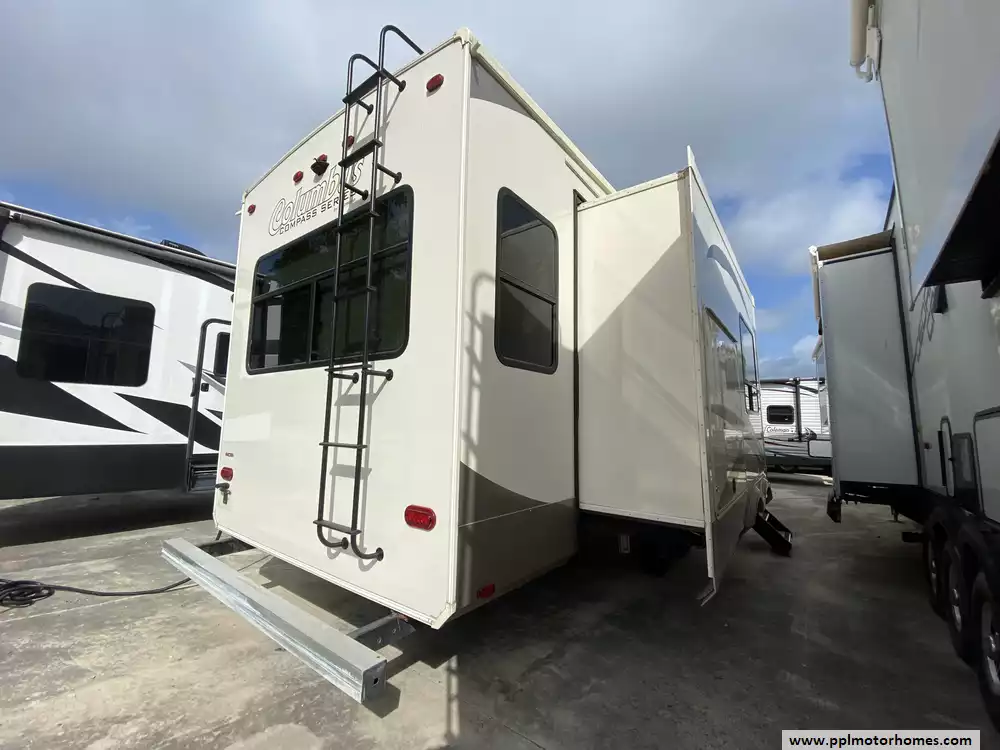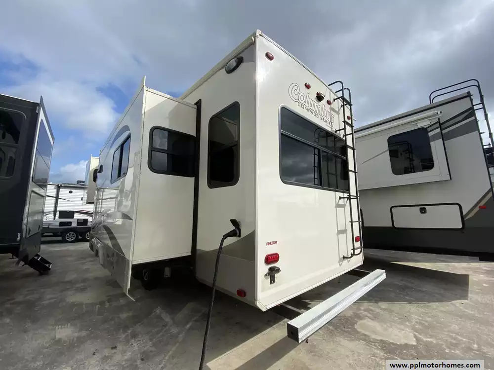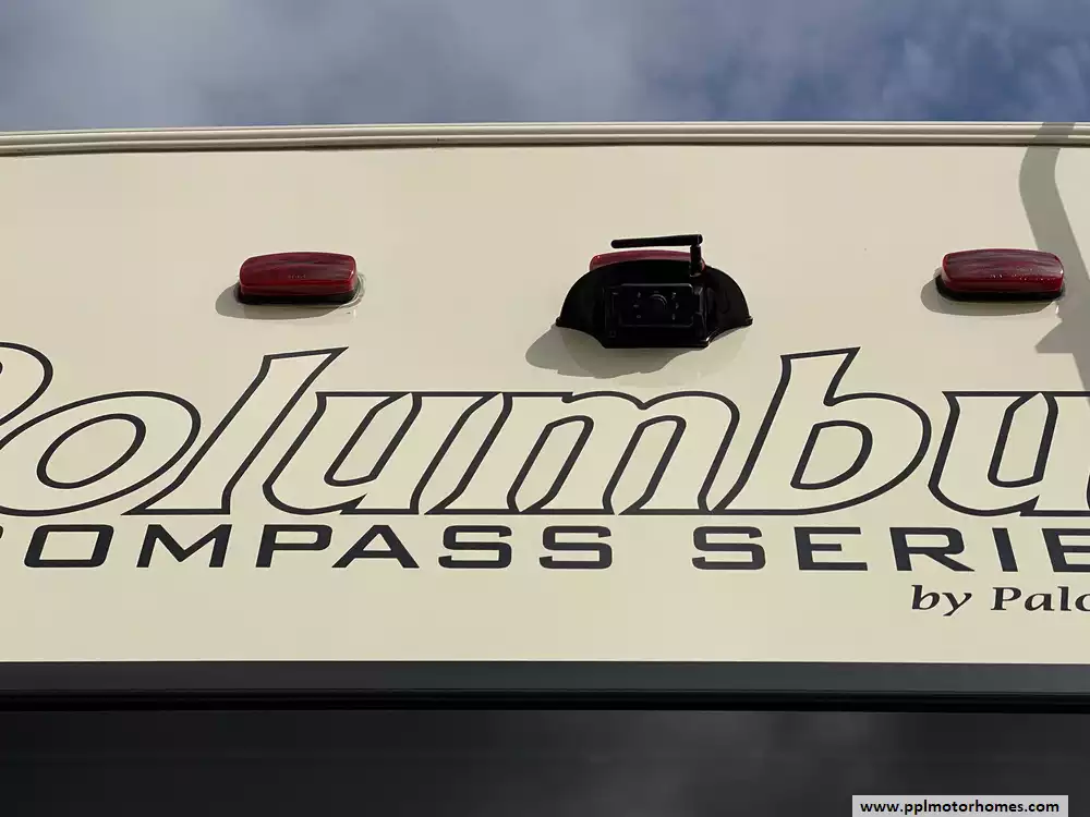 This 2019 Palomino Columbus 298RL has a Hydraulic Landing Gear, 3 Slide-outs, 2 Ducted Air Conditioners, Lg Refrigerator, Automatic Main Awning, Washer/Dryer Connections, Heated Tanks, Outside Speakers, TV, DVD Player, Outdoor Kitchen, Outside Shower, Fireplace, Central Vacuum, Microwave, 3 Burner Range, Oven