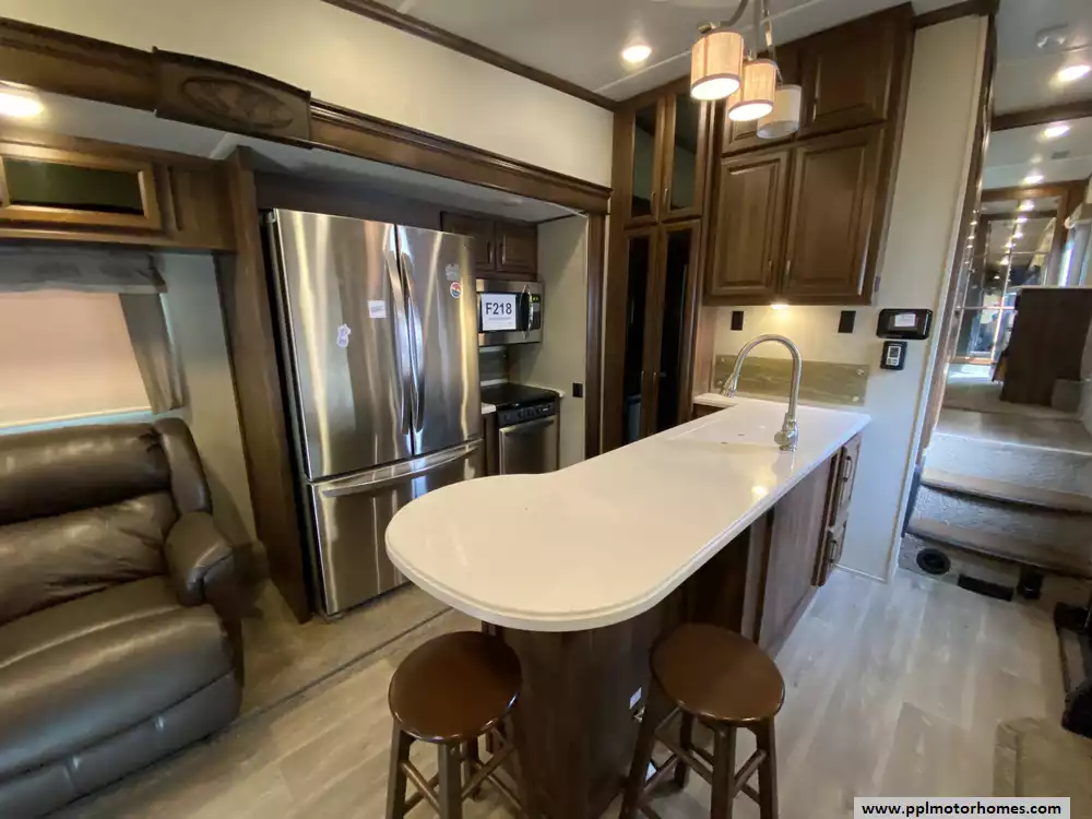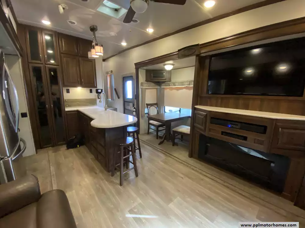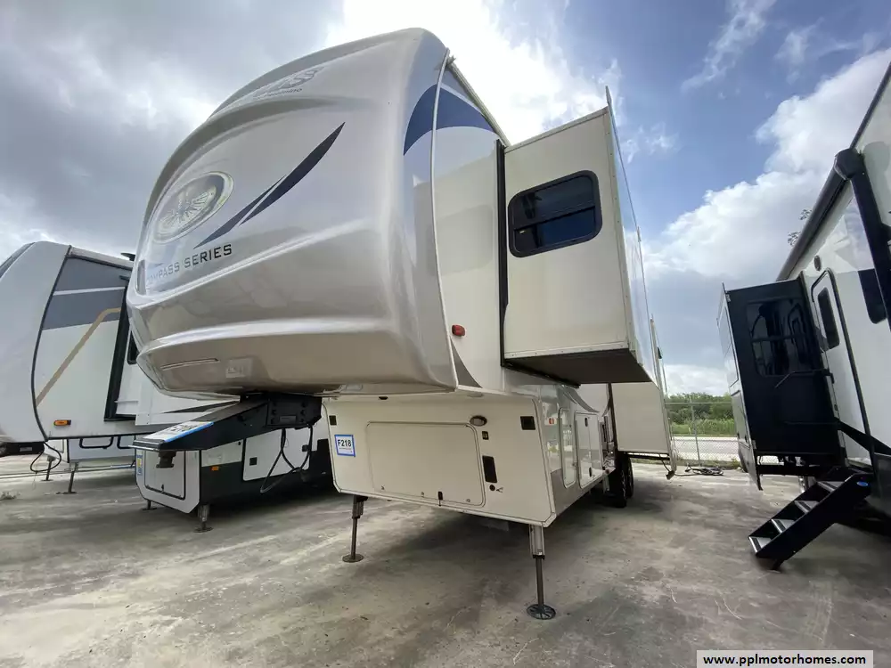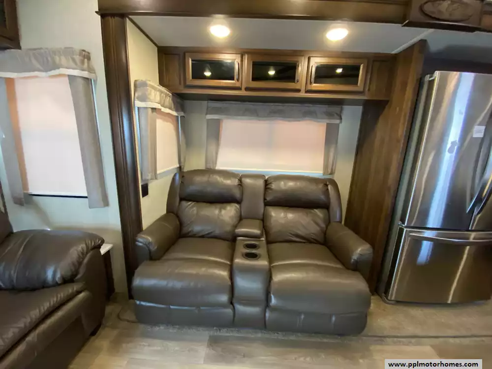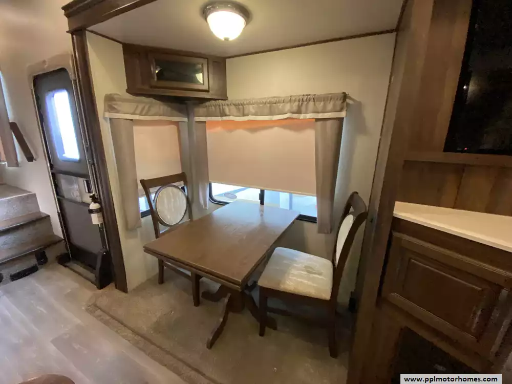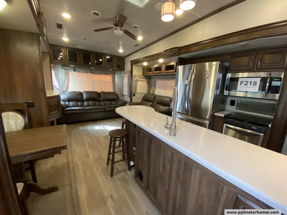 This 2019 Palomino Columbus 298RL has a Hydraulic Landing Gear, 3 Slide-outs, 2 Ducted Air Conditioners, Lg Refrigerator, Automatic Main Awning, Washer/Dryer Connections, Heated Tanks, Outside Speakers, TV, DVD Player, Outdoor Kitchen, Outside Shower, Fireplace, Central Vacuum, Microwave, 3 Burner Range, Oven