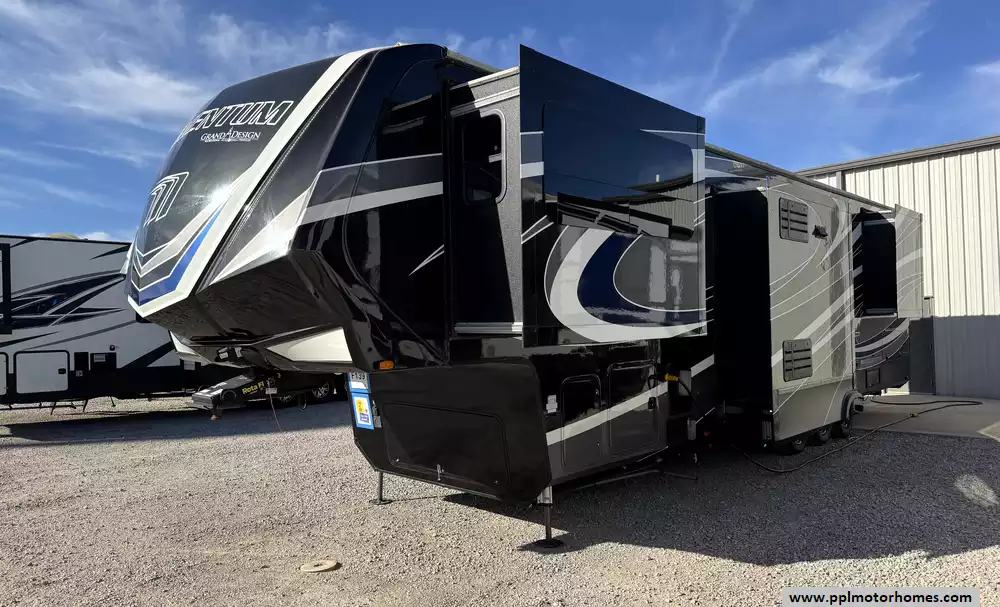 This 2019 Momentum 376TH has FULL BODY PAINT, Hydraulic Landing Gear, 5 Slide-outs, Onan Propane Generator, 3 Ducted Air Conditioners, 4 Door Side by Side Gas/110v/12v Norcold Refrigerator, Automatic Main Awning And Window/Door Awnings, Washer/Dryer, Satellite Dish, Outside Entertainment System, 3 TVs, Outdoor Kitchen, Outside Shower, Fireplace, Central Vacuum, Convection Microwave, 3 Burner Range, Oven