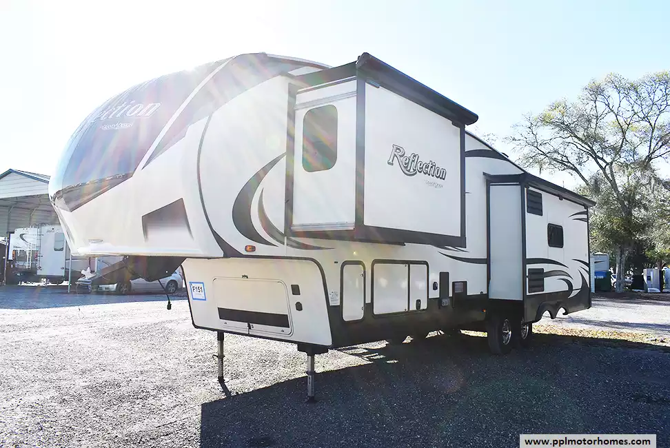 This 2019 Reflection 337RLS has an Electric Landing Gear, 3 Slide-outs, 2 Ducted Air Conditioners, 4 Door Gas Dometic Refrigerator, Automatic Main Awning And Slide Awning, Satellite Receiver, Outside Stereo, TV, DVD Player, Outside Shower, Fireplace, Convection Microwave, 3 Burner Range, Oven