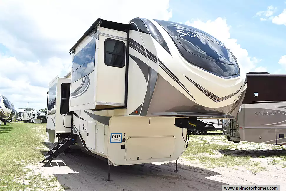 This 2019 Solitude 379FLS has a Hydraulic Landing Gear, 5 Slide-outs, 2 Ducted Air Conditioners, 4 Door Gas/110v Norcold Refrigerator, Automatic Main Awning And Slide Awning, Washer/Dryer Connections, Outside Speakers, 2 TVs, DVD Player, Outside Shower, Fireplace, Central Vacuum, Convection Microwave, 3 Burner Range, Oven