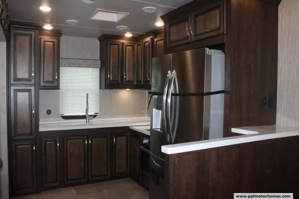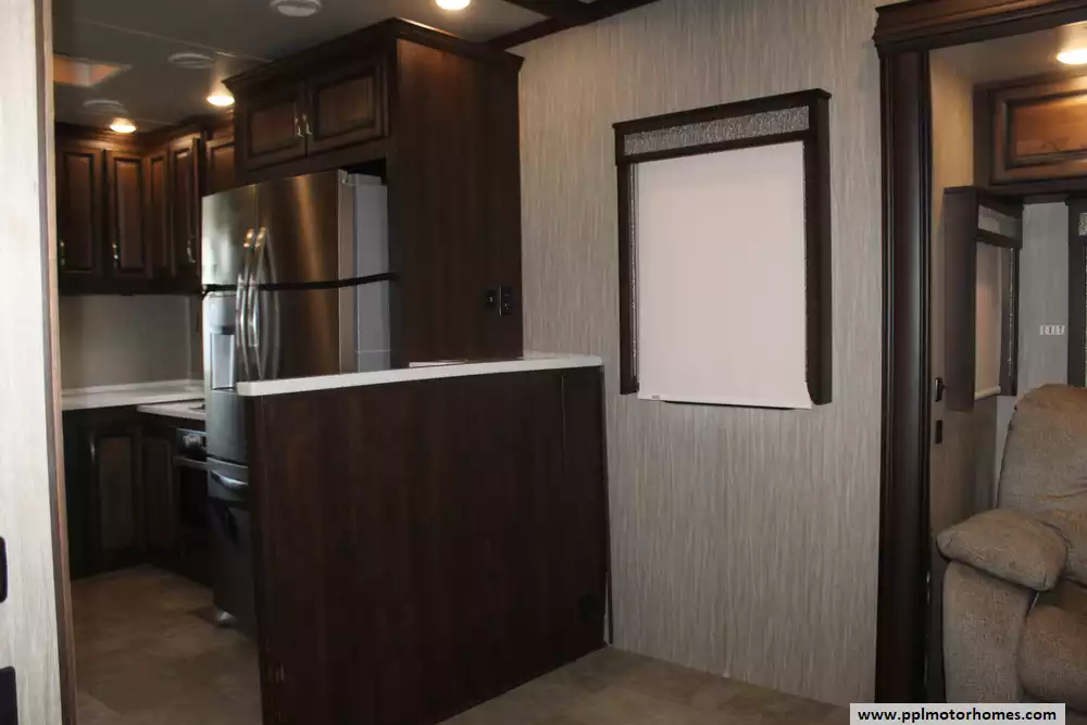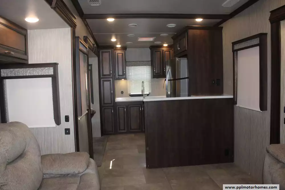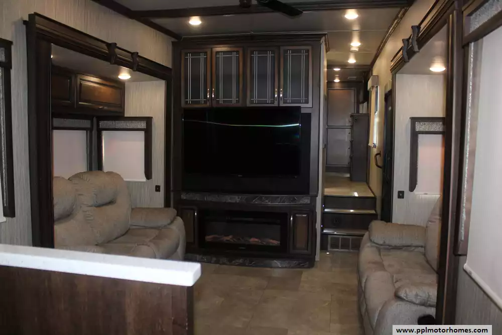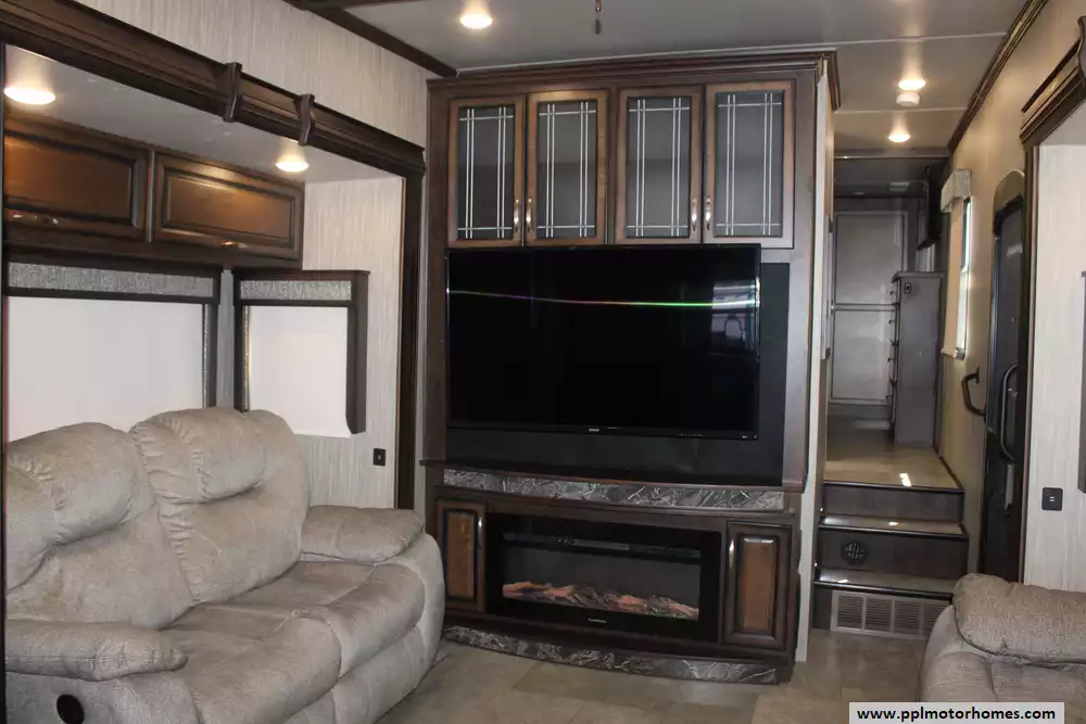 Experience true residential luxury in this 2019 Big Country 3806RKD by Heartland. Known for its robust construction and sophisticated interior design, the Big Country line is a favorite among full-time travelers who value high-end finishes and a spacious, home-like feel. This 42-foot fifth wheel features a fiberglass exterior and a durable rubber roof, supported by a hydraulic landing gear system for easy setup. The unique rear-kitchen layout is a standout quality of this model, offering an expansive workspace that includes a four-burner range, oven, convection microwave, and a 110v residential refrigerator equipped with an in-fridge ice maker. With four slide-outs, the interior opens up into a massive living area anchored by a cozy fireplace and a large TV, providing the perfect environment for relaxation or entertaining.