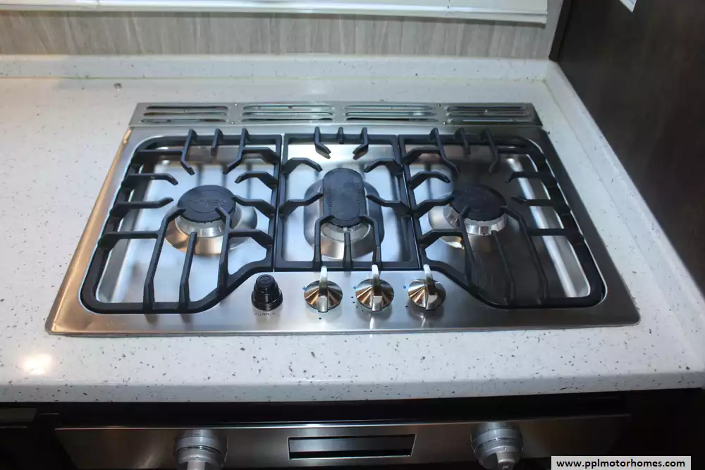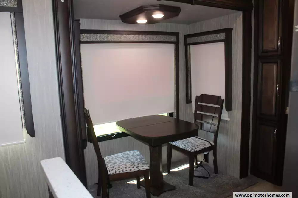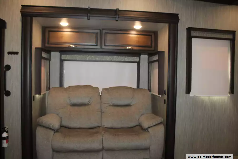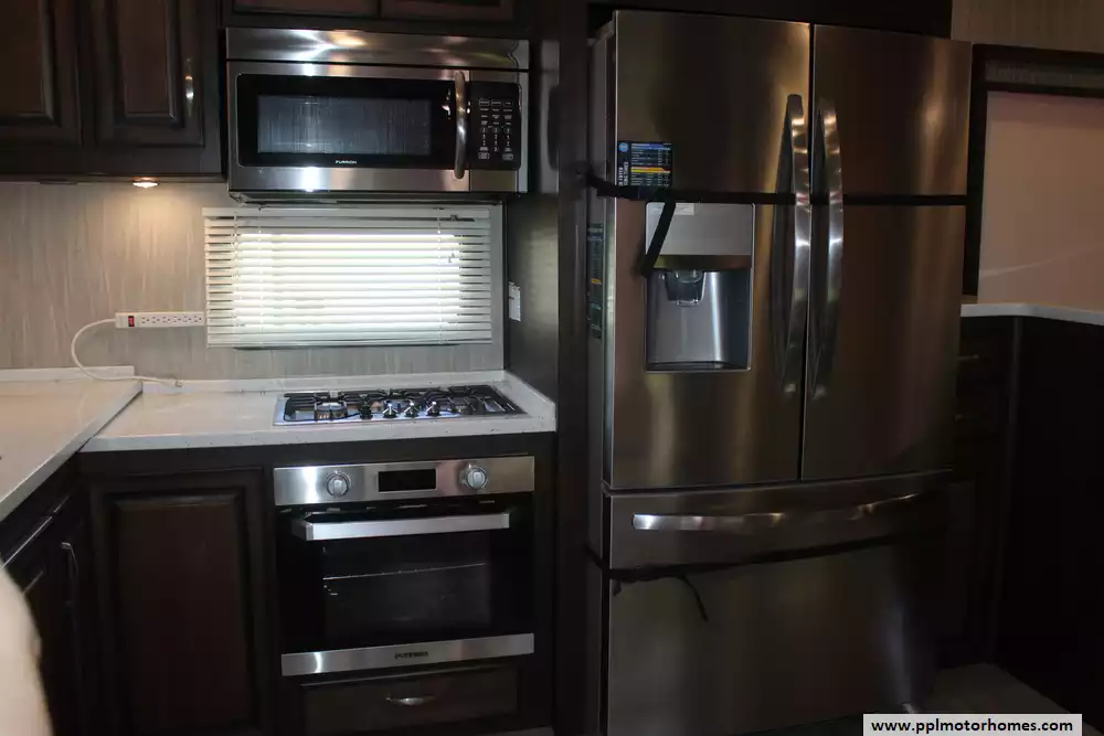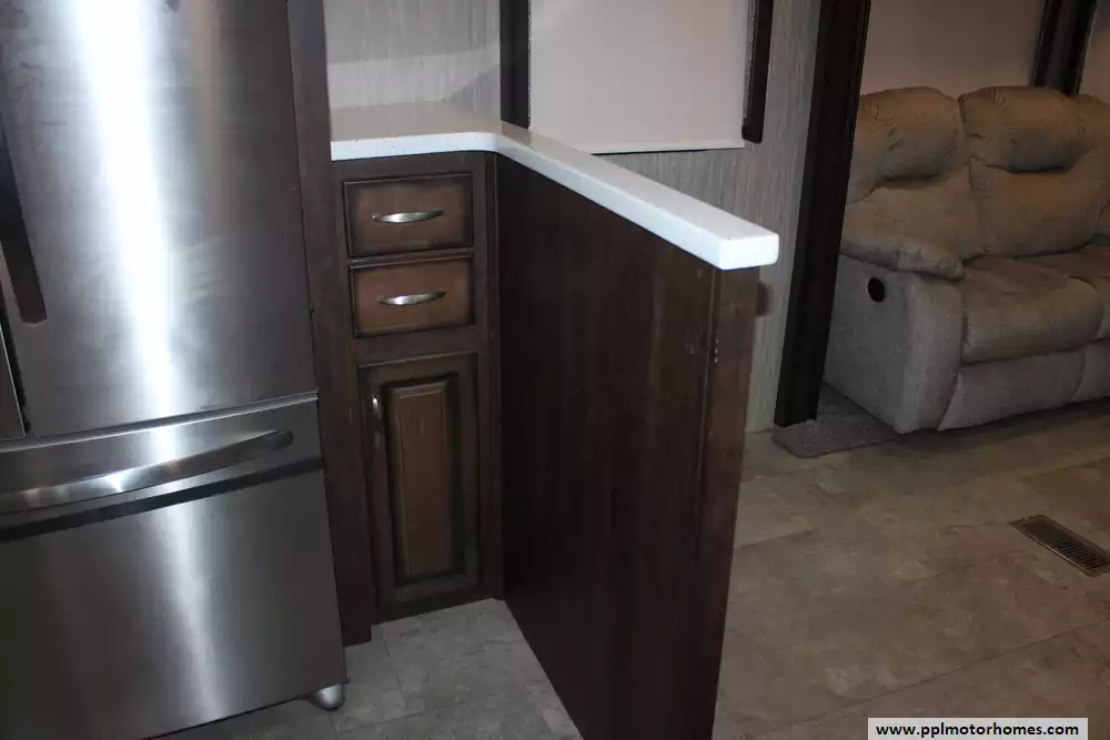 Experience true residential luxury in this 2019 Big Country 3806RKD by Heartland. Known for its robust construction and sophisticated interior design, the Big Country line is a favorite among full-time travelers who value high-end finishes and a spacious, home-like feel. This 42-foot fifth wheel features a fiberglass exterior and a durable rubber roof, supported by a hydraulic landing gear system for easy setup. The unique rear-kitchen layout is a standout quality of this model, offering an expansive workspace that includes a four-burner range, oven, convection microwave, and a 110v residential refrigerator equipped with an in-fridge ice maker. With four slide-outs, the interior opens up into a massive living area anchored by a cozy fireplace and a large TV, providing the perfect environment for relaxation or entertaining.