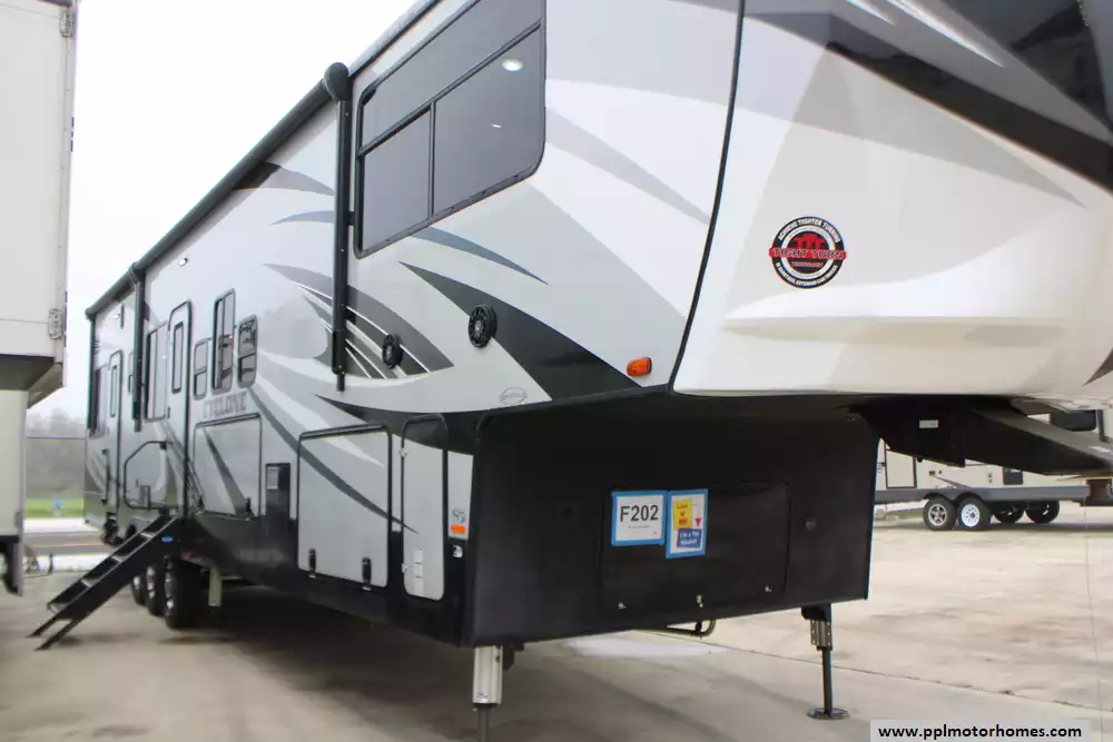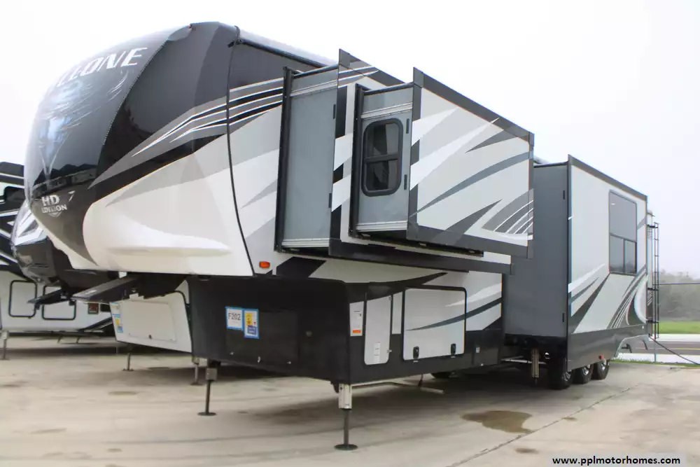 This 2019 Cyclone 4007 has a Hydraulic Landing Gear, 3 Slide-outs, Onan Gas Generator, 3 Ducted Air Conditioners, Double Door Residential Hisense Refrigerator (Additional Refrigerator Present), 2 Automatic Main Awning And Rear Door Awning, Washer/Dryer Connections, Outside Entertainment System with TV, 3 TVs, 2 DVD Players, Outdoor Kitchen, Outside Shower, Fireplace, Central Vacuum, Microwave, 3 Burner Range, Oven