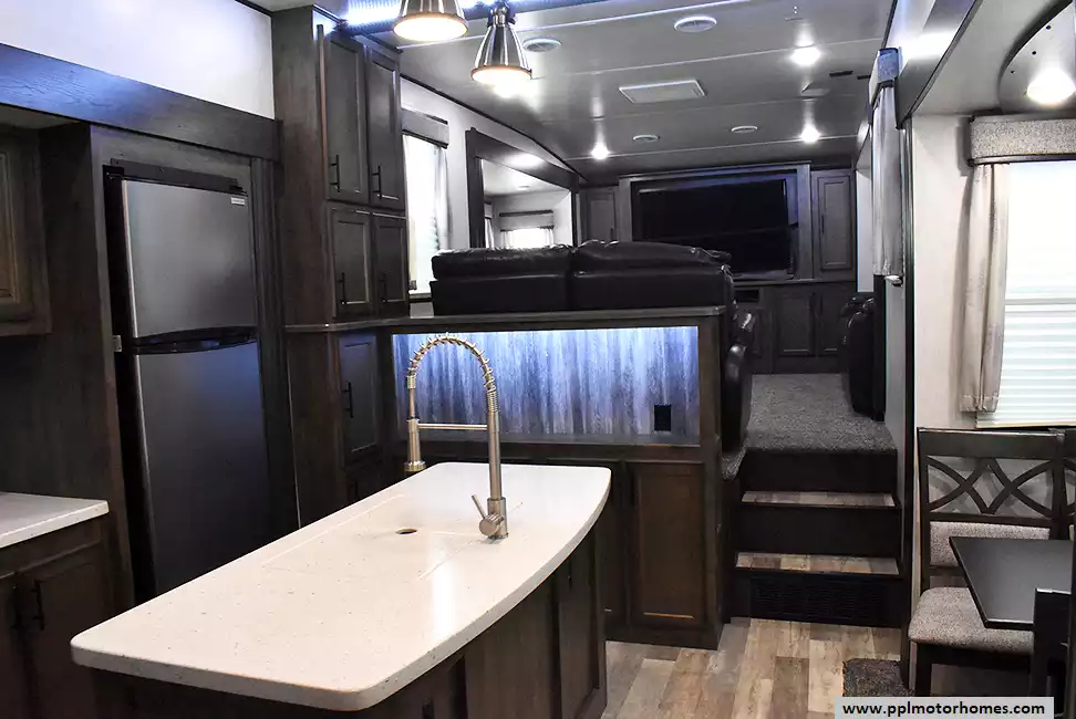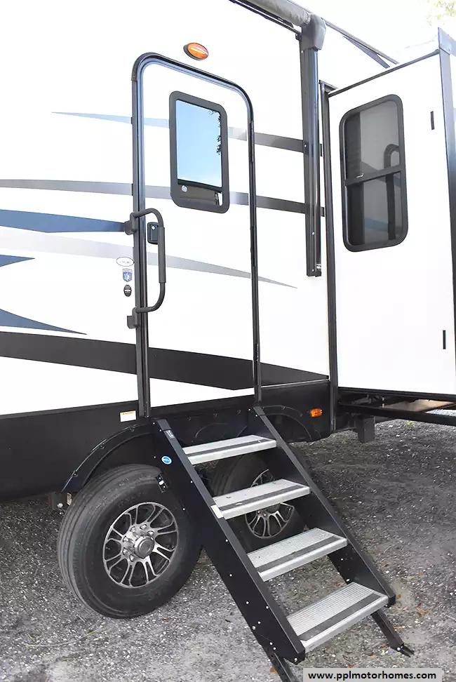 This 2019 Milestone 379FLML has an Electric Landing Gear, 5 Slide-outs, 2 Non-Ducted Air Conditioners, Double Door Everchill Refrigerator, Automatic Main Awning, Satellite Receiver, Outside Stereo, TV, DVD Player, Outside Shower, Microwave, 3 Burner Range, Oven