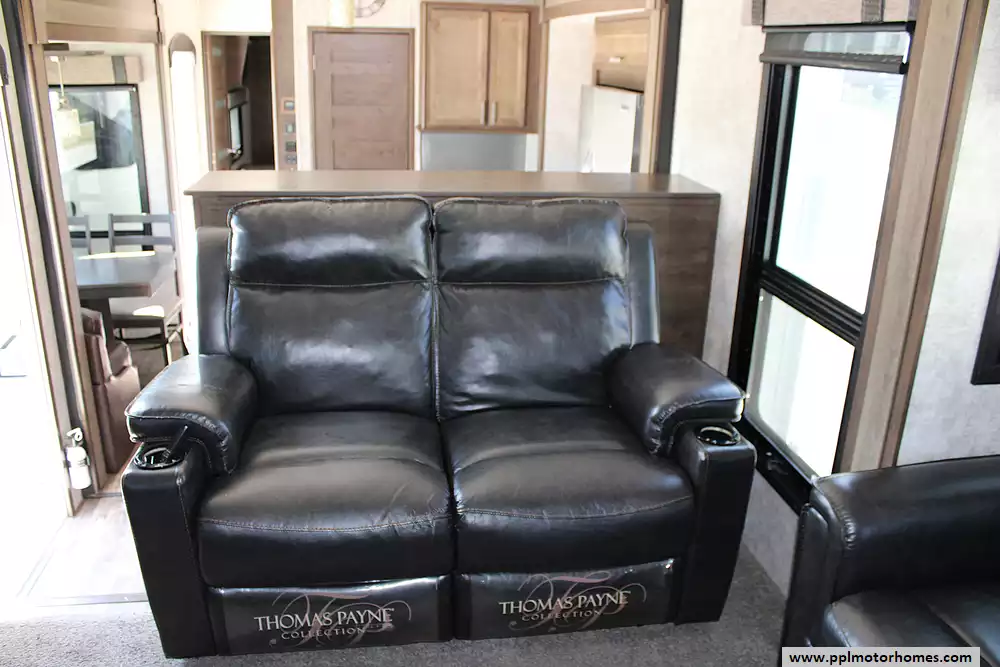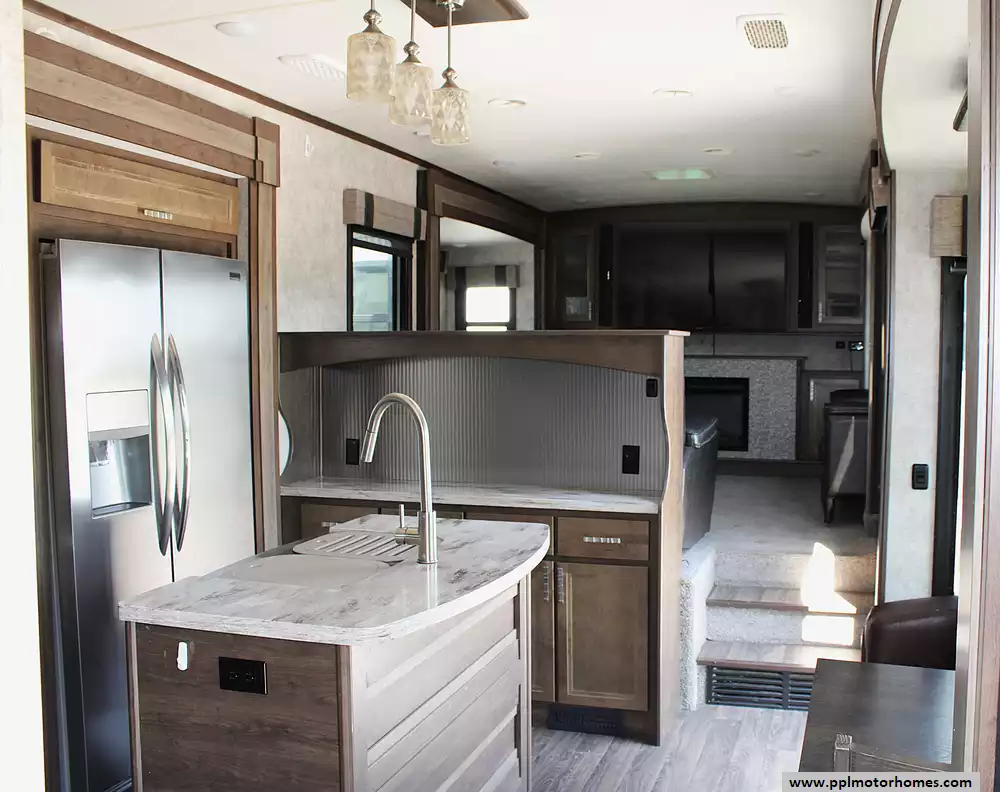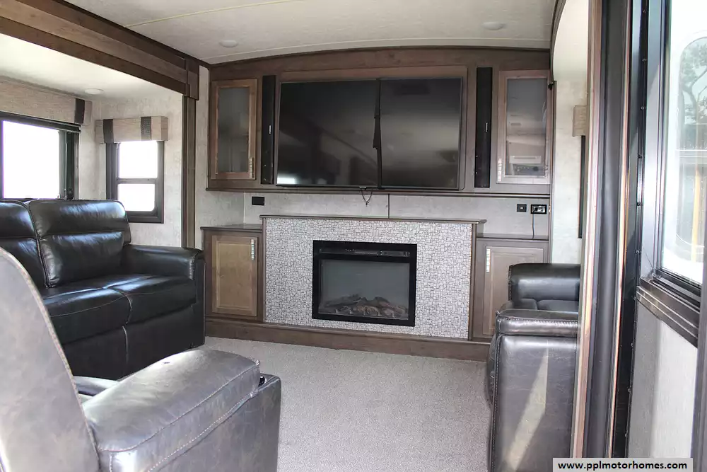 2019 Highland Ridge Open Range 3X 387RBS is built to impress, offering true residential luxury in a fifth wheel that's ready for adventure. Stretching over 41 feet with five expansive slide-outs, this coach feels more like a high-end apartment than an RV. The front living area with dual sofas, theater seating, fireplace, and entertainment center creates the perfect gathering spot for family and friends, while the massive rear bathroom with dual vanities and a large walk-in shower adds a touch of spa-like comfort. Designed with Highland Ridge's Extreme Arctic package, this unit is ready for all-season travel, whether you're chasing summer or settling in for cozy winter nights.