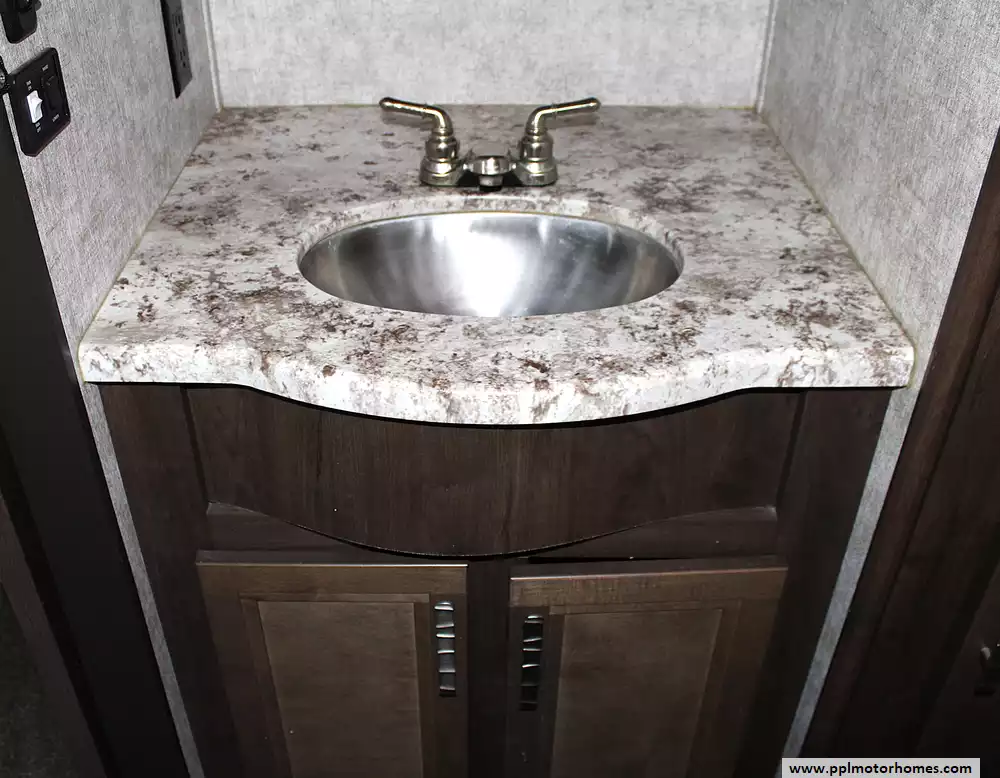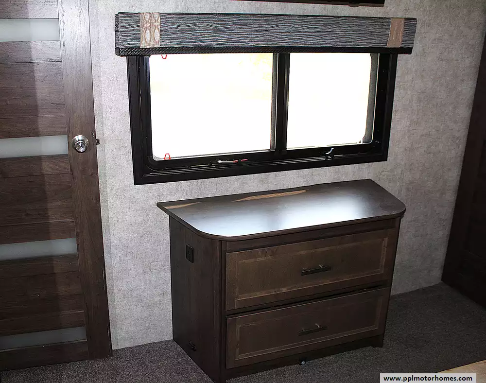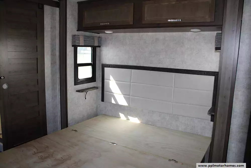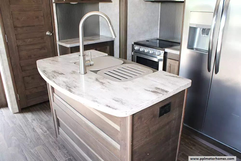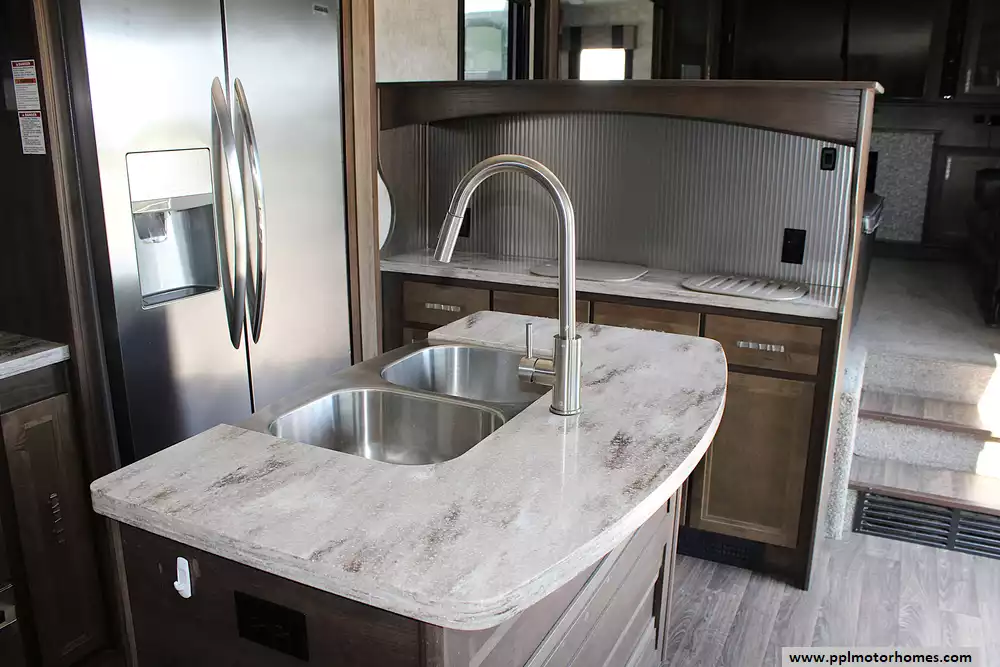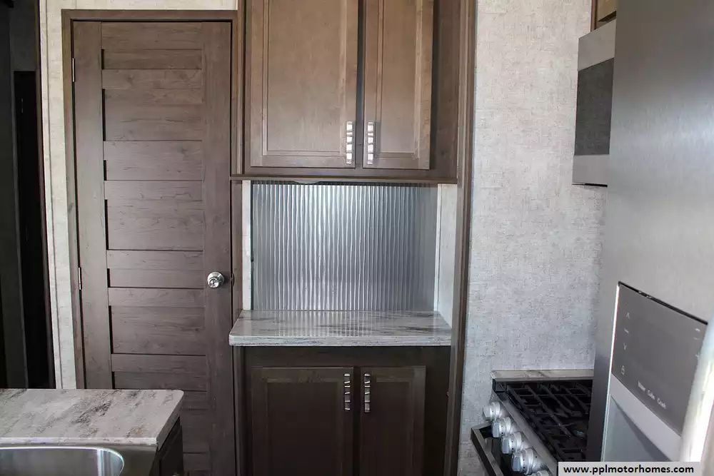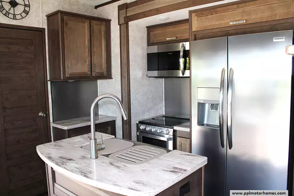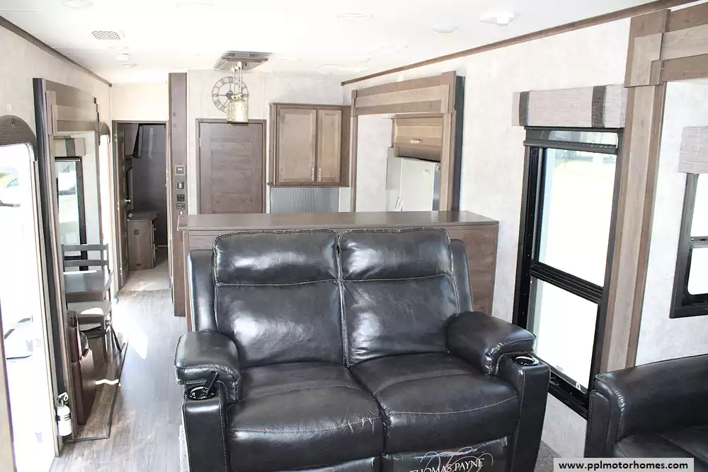 This beautiful coach comfortably sleeps up to 6 people, making it perfect for families or couples who love to host. The front living room sofas convert into sleeping spaces for guests, while the private master bedroom offers a spacious walk-around queen bed with an option to upgrade to a king. Inside the kitchen, you'll find a residential refrigerator, solid surface countertops, a large pantry, and a center island--ideal for cooking and entertaining on the road. With vaulted ceilings, washer/dryer prep, and thoughtful storage throughout, this RV was designed with long-term comfort in mind.