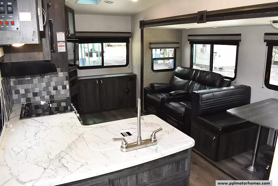 This 2019 Open Range Ultra Lite 2502RE has an Electric Landing Gear, 2 Slide-outs, 1 Non-Ducted Air Conditioner, Double Door Gas/12v Norcold Refrigerator, Automatic Main Awning, 2 TVs, DVD Player, Outdoor Grill, Outdoor Kitchen, Outside Shower, Fireplace, Microwave, 3 Burner Range, Oven