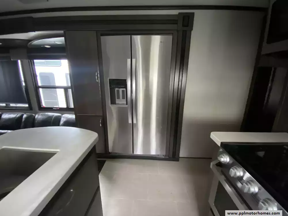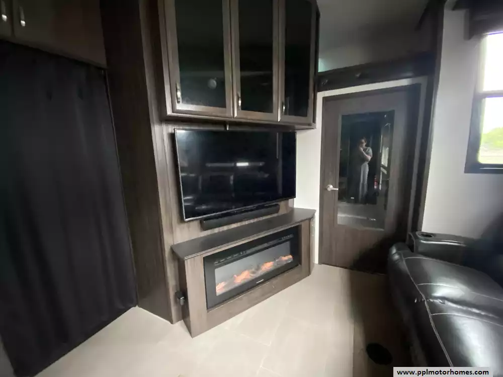 Inside, the dual slide-outs create an expansive living area centered around a warm fireplace and a full entertainment suite featuring three TVs and a DVD player. The chef-inspired kitchen is fully equipped with a side-by-side 12v residential Whirlpool refrigerator with an in-fridge ice maker, a microwave, an oven, and a three-burner range. With added conveniences like washer/dryer connections and an outside shower, this Seismic 4113 offers the perfect blend of utility and sophistication. Whether you are hauling gear or hosting guests, this premium coach provides the durability and high-end amenities required for a first-class travel experience.