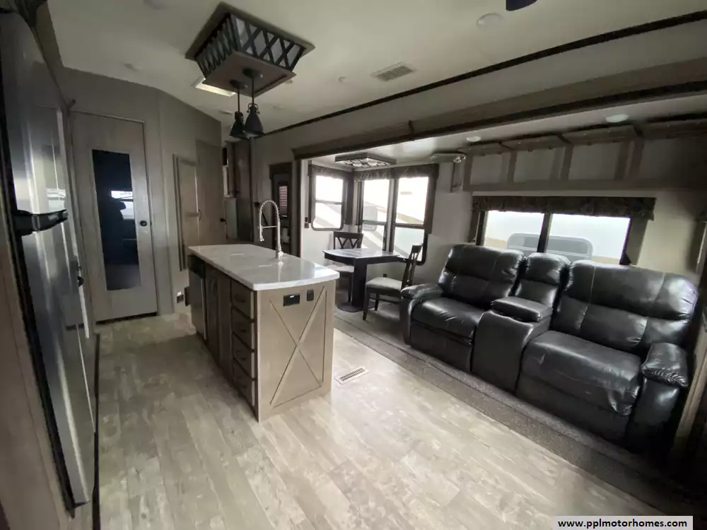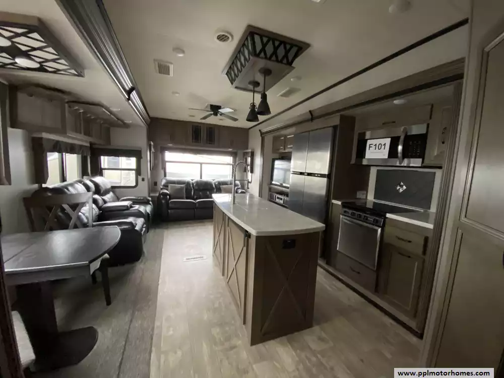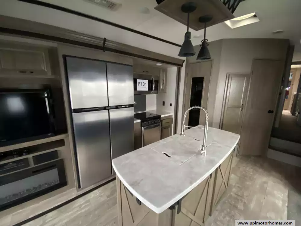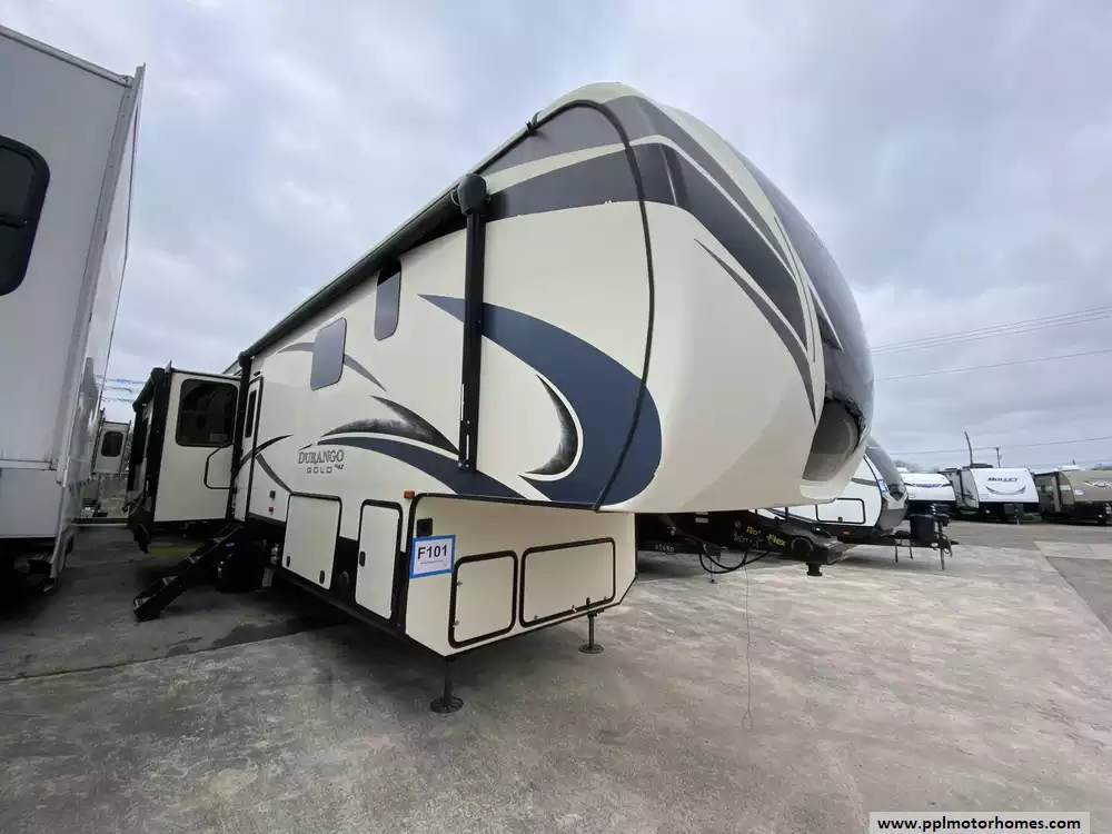 This 2019 Durango Gold G366FBT has a Hydraulic Landing Gear, 3 Slide-outs, 4 Door Gas/110v Norcold Refrigerator, Automatic Main Awning And Slide Awning, Washer/Dryer, Outside Speakers, 2 TVs, Outside Shower, Fireplace, Central Vacuum, Convection Microwave, 3 Burner Range, Oven