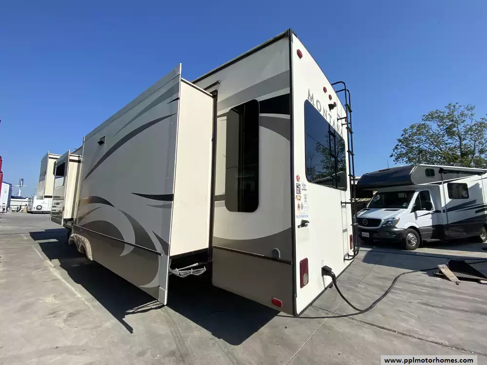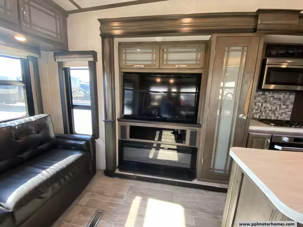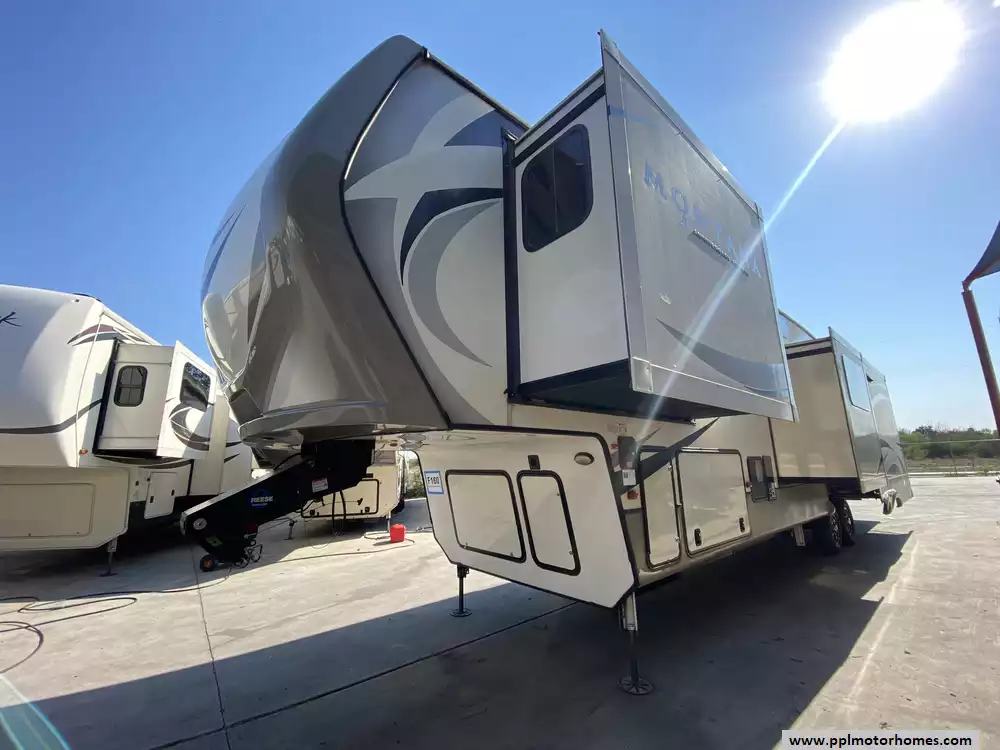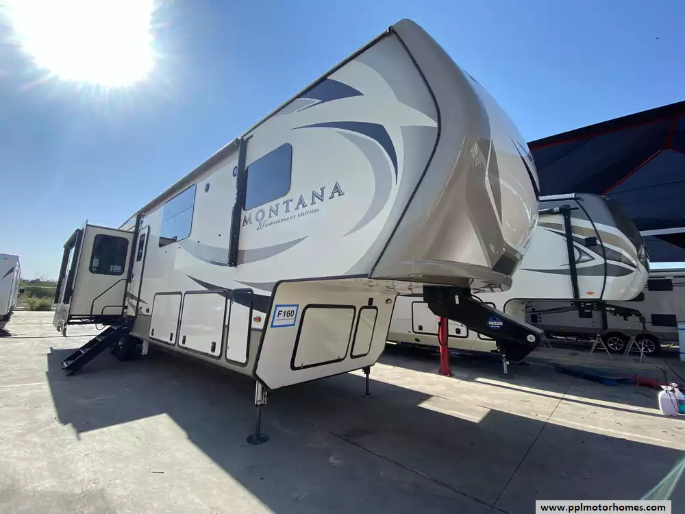 This 2019 Montana 20th Anniversary 3855BR has a Hydraulic Landing Gear, 4 Slide-outs, 2 Ducted Air Conditioners, Double Door 110v Ge Refrigerator (Additional Refrigerator Present), In-Fridge Ice Maker, Automatic Main Awning, Washer/Dryer Connections, Heated Tanks, Satellite Dish, Outside Speakers, 2 TVs, 2 DVD Players, Outdoor Kitchen, Outside Shower, Fireplace, Central Vacuum, Convection Microwave, 3 Burner Range, Oven