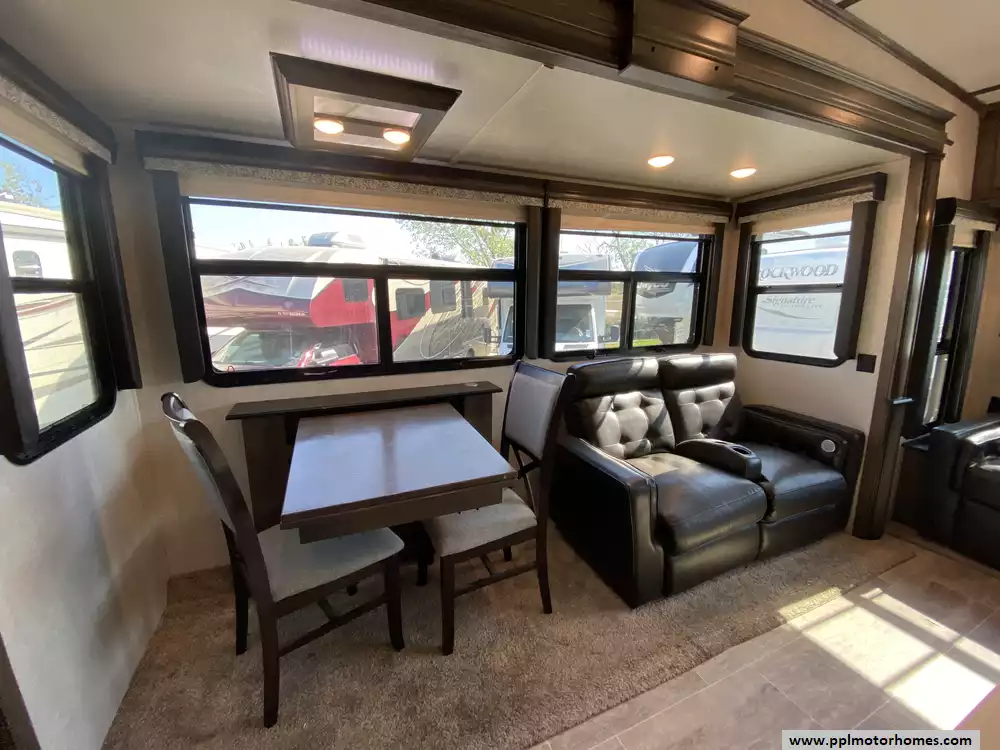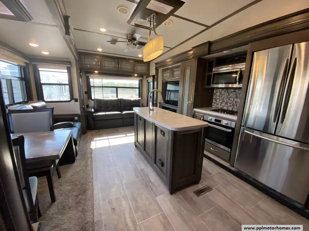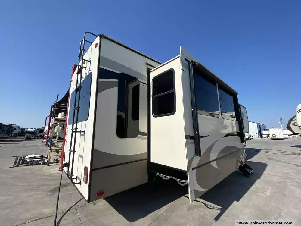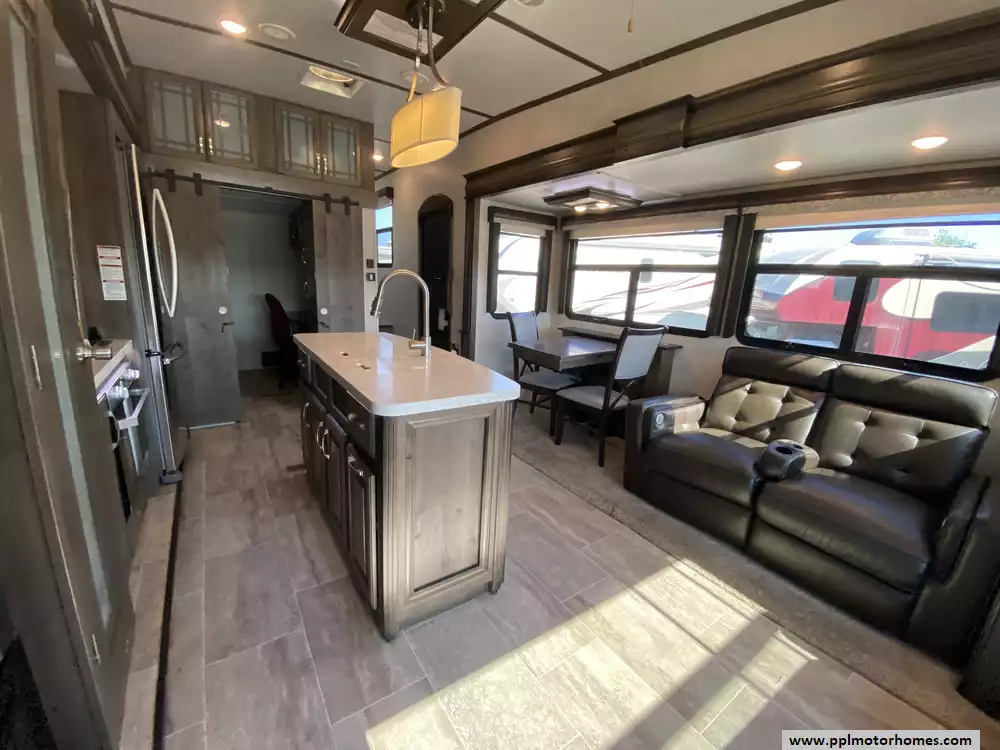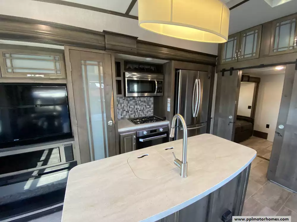 This 2019 Montana 20th Anniversary 3855BR has a Hydraulic Landing Gear, 4 Slide-outs, 2 Ducted Air Conditioners, Double Door 110v Ge Refrigerator (Additional Refrigerator Present), In-Fridge Ice Maker, Automatic Main Awning, Washer/Dryer Connections, Heated Tanks, Satellite Dish, Outside Speakers, 2 TVs, 2 DVD Players, Outdoor Kitchen, Outside Shower, Fireplace, Central Vacuum, Convection Microwave, 3 Burner Range, Oven