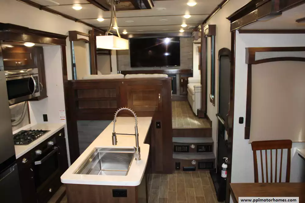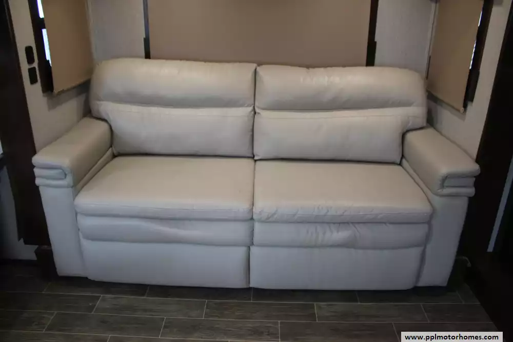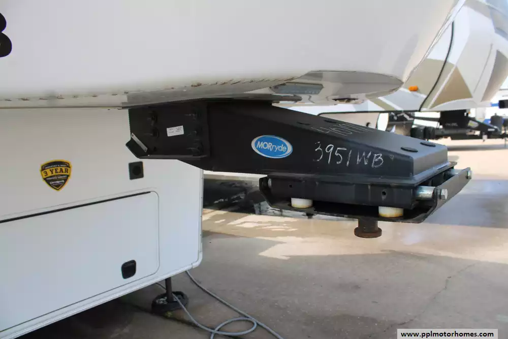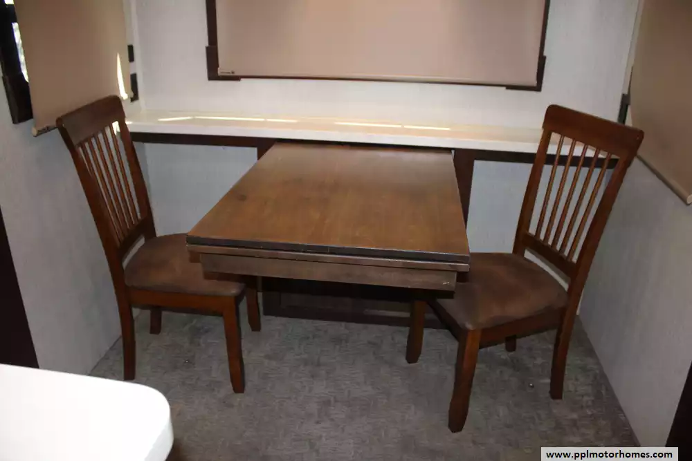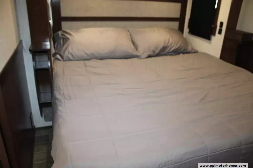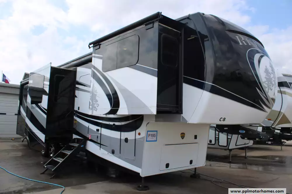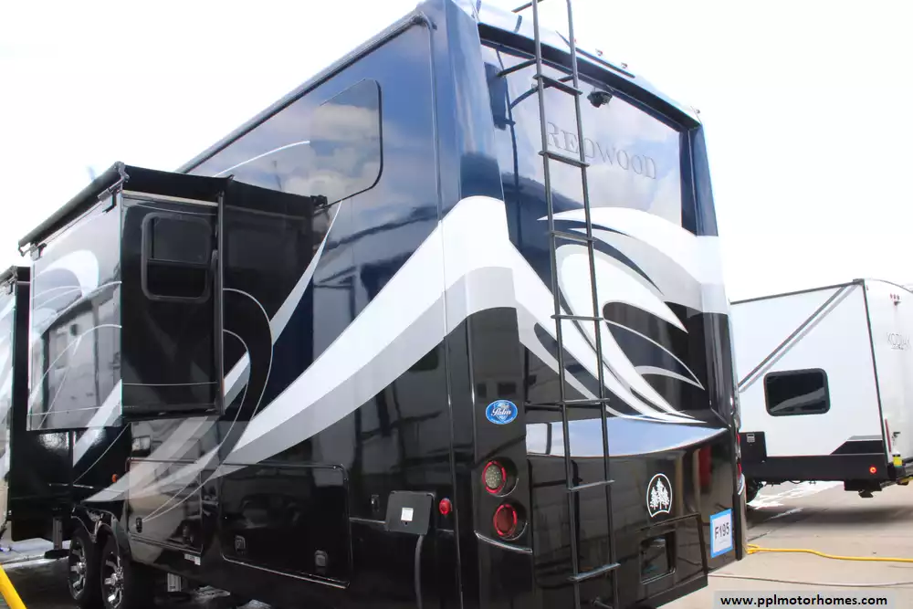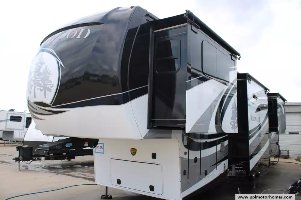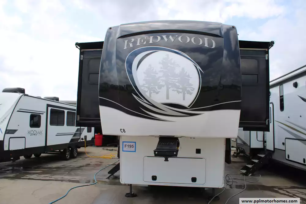 This 2019 Redwood 3951WB is a luxurious fifth wheel designed for full-time RV living and extended travel. Measuring 42.33 feet in approximate length and featuring five slide-outs, it offers an expansive interior with a spacious living area, a well-appointed kitchen, and a master suite with a king-size bed. The rear bathroom includes a large shower, porcelain toilet, and ample storage. High-end amenities such as full body paint, three 15K BTU air conditioners, and a 35,000 BTU furnace ensure comfort in various climates. The RV is equipped with a 2-piece washer/dryer, and features a 12-gallon water heater. Other highlights include tinted frameless windows, 6-point one-touch hydrualic leveling with pads, wine cooler, solar prep, theater seating with heat/massage/USB ports, and rear camera. With a dry weight of 15,218 lbs dry and a payload capacity of 2,682 lbs, it is built for durability and extended journeys. The exterior boasts a sleek design with multiple color options, while the interior showcases elegant finishes and modern conveniences. Let the memories begin in this 2019 Redwood 3951WB!