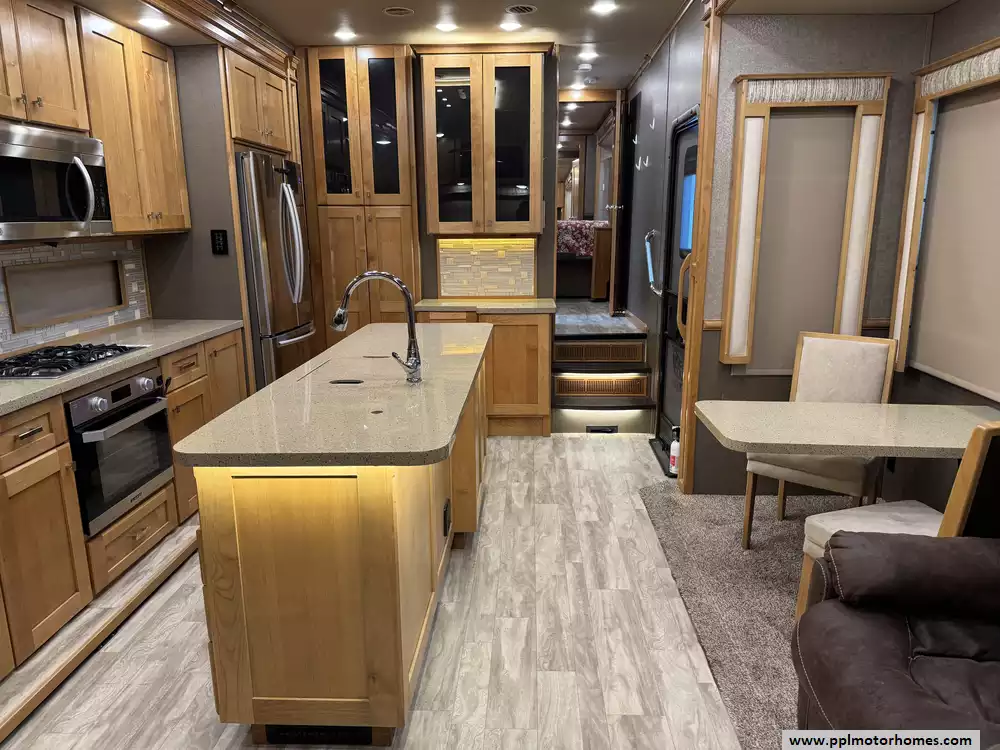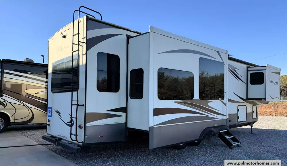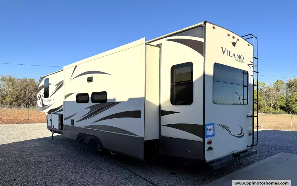 This beautiful 2019 Vilano 360RL has the most counter space of any Vilano, along with a spectacular 72" view above the Residential Chef Range You'll also enjoy solid surface kitchen countertops, residential features like a dishwasher, kitchen faucet with pull-down sprayer. It also has a Hydraulic Landing Gear, 3 Slide-outs, 3 Ducted Air Conditioners, Lg Refrigerator, In-Fridge Ice Maker, Main/Door Awnings, Washer/Dryer, Outside Speakers, TV, Outside Shower, Fireplace, Microwave, 3 Burner Range, Oven