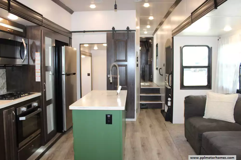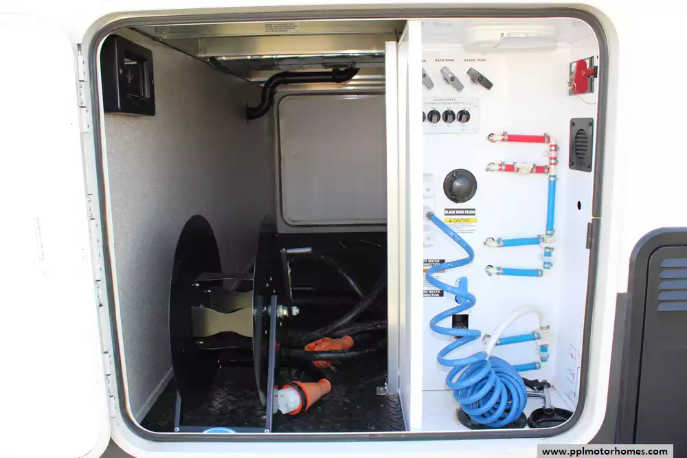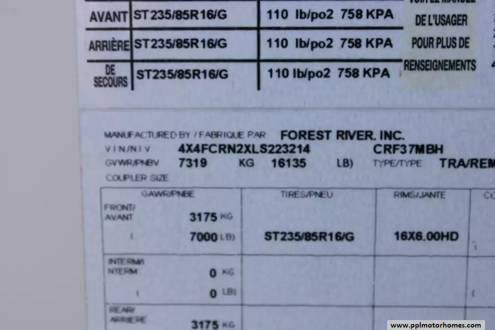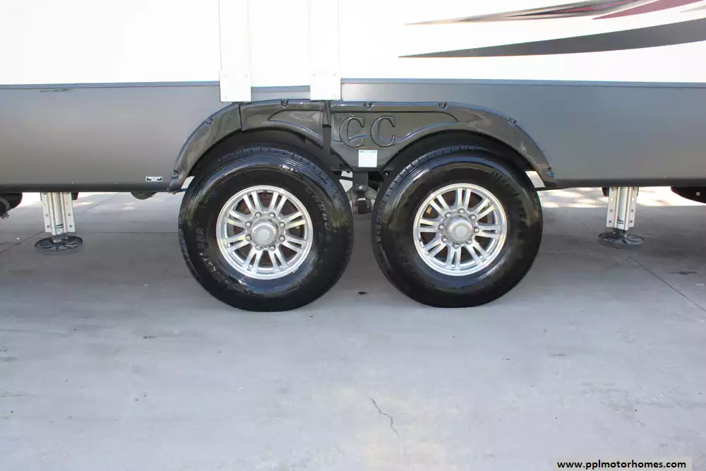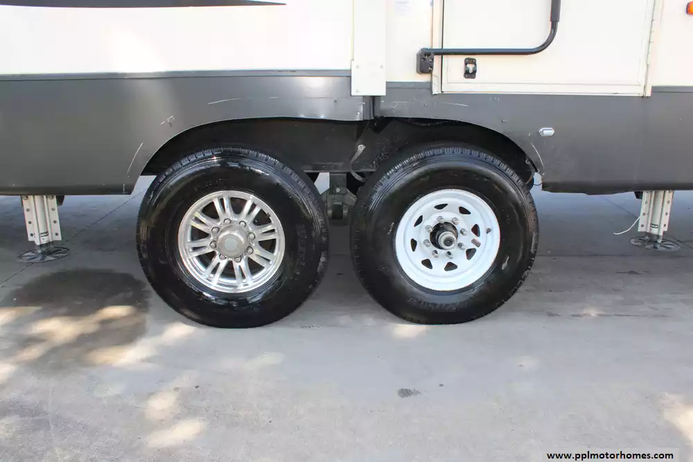 Specs: Length: 40.67 ft., Width: 8 ft., Height: 13.42 ft., Payload Capacity: 3,456 lbs., Total Fresh Water Tank Capacity: 69 gal., Total Gray Water Tank Capacity: 80 gal., Total Black Water Tank Capacity: 40 gal., Total Number of Propane Tanks: 2.
