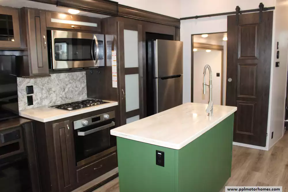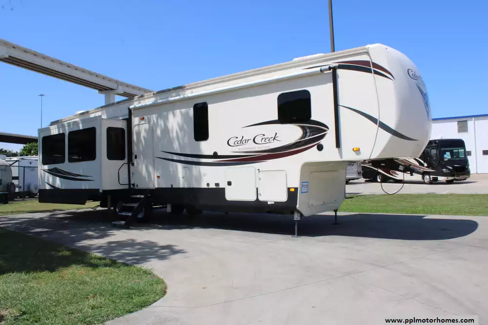 This 2020 Cedar Creek Silverback 37MBH is a luxurious fifth-wheel RV designed for families or travelers seeking a spacious and versatile living space. Features Include...4 Slide-outs, 2 Ducted Air Conditioners, Double Door Residential Insignia Refrigerator, Automatic Main Awning, Washer/Dryer Connections, Outside Speakers, 2 TVs, DVD Player, Outside Shower, Fireplace, Microwave, 3 Burner Range, and Oven. Its well-thought-out layout and quality features make it an excellent choice for travelers seeking a reliable and comfortable RV experience.