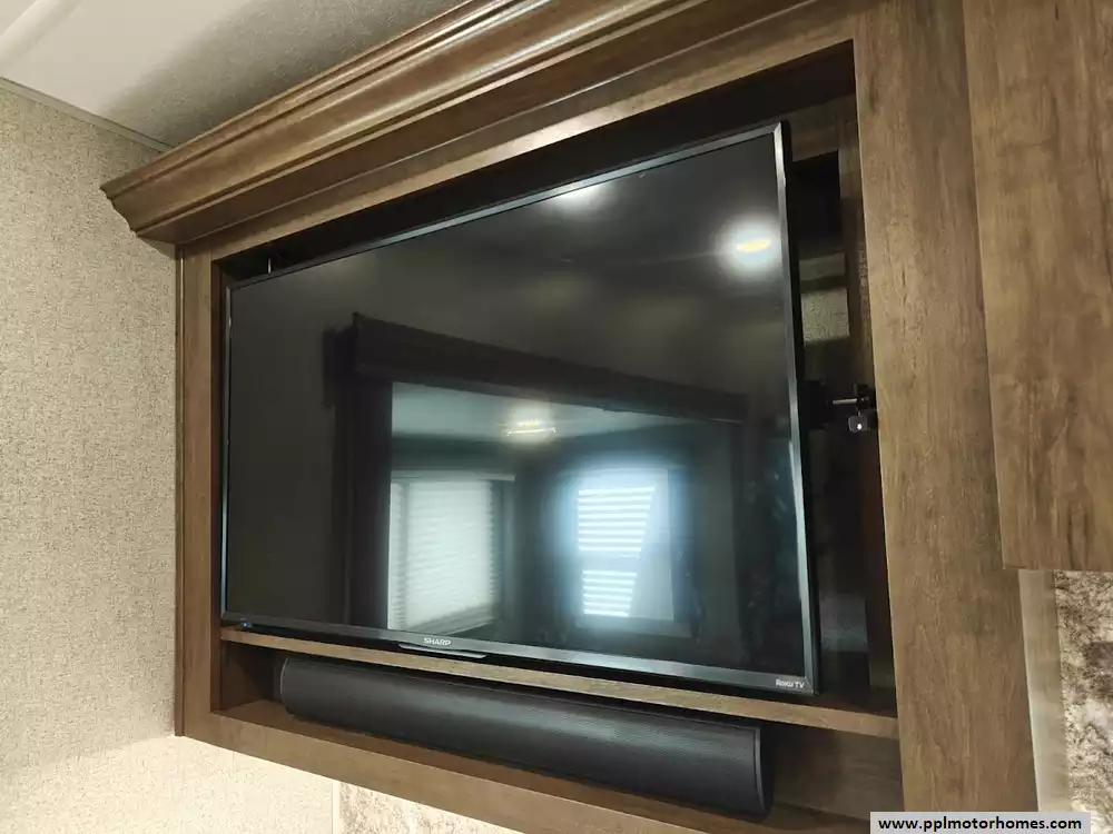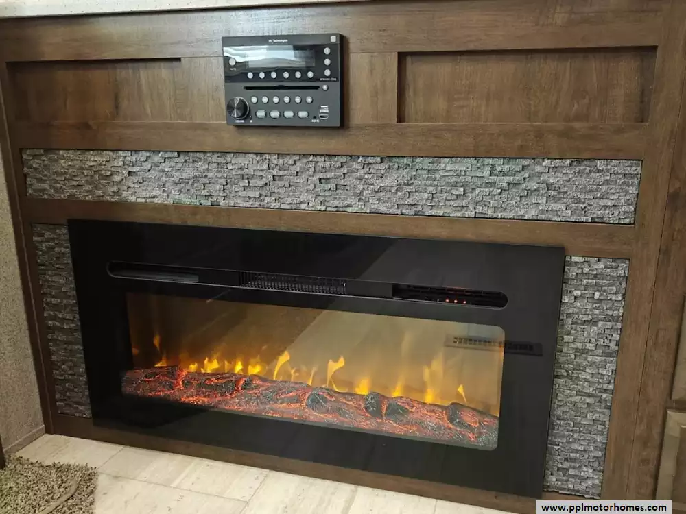 Inside, the residential-style amenities provide a true home-away-from-home experience. The gourmet kitchen is fully equipped with a double-door 12v Insignia refrigerator, three-burner range, oven, and microwave, while the cozy living area features an inviting fireplace and two TVs for premium entertainment. You will stay perfectly cool in any weather with two ducted air conditioners, and the addition of an outside shower and external speakers makes this the ultimate setup for hosting or relaxing. From its thoughtful storage solutions to its premium construction, the Flagstaff 529MBS delivers the comfort and reliability that have made Forest River a leader in the industry.
