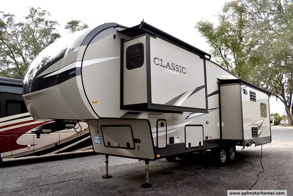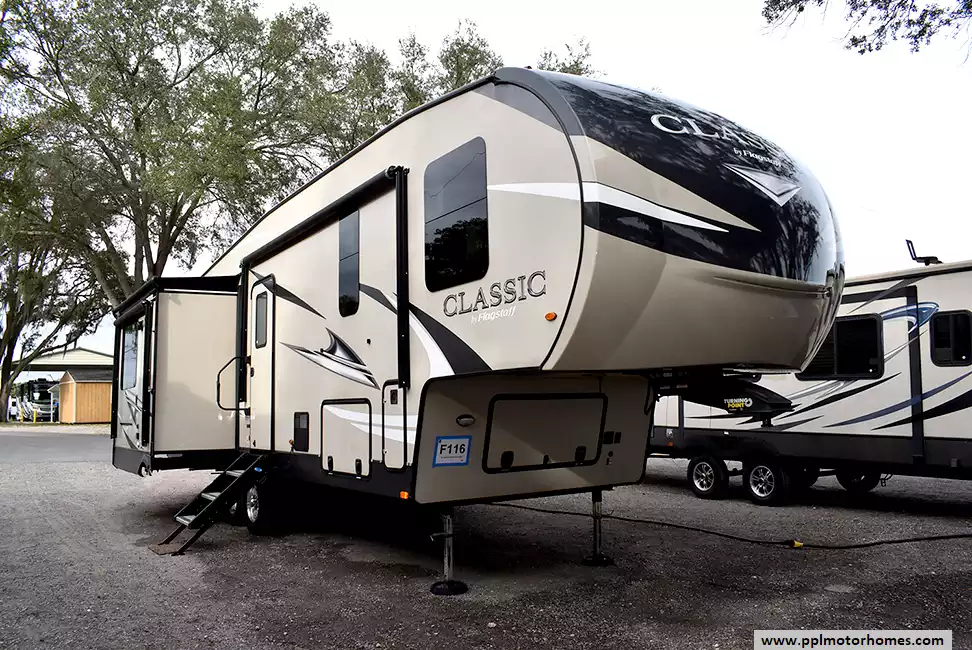 This 2020 Forest River Flagstaff Classic 8529IKSB is a fifth-wheel RV designed for comfort and style. With multiple slide-outs, it creates an expansive living space featuring a well-appointed kitchen, elegant furnishings, and a cozy living area with a fireplace. The master bedroom boasts a comfortable queen-sized bed, and the bathroom is equipped with modern fixtures. Built with quality construction and attention to detail, this Flagstaff Classic model ensures a stable and enjoyable towing experience. Ideal for those who seek both sophistication and functionality, it provides a luxurious and comfortable home on wheels for unforgettable journeys on the road.