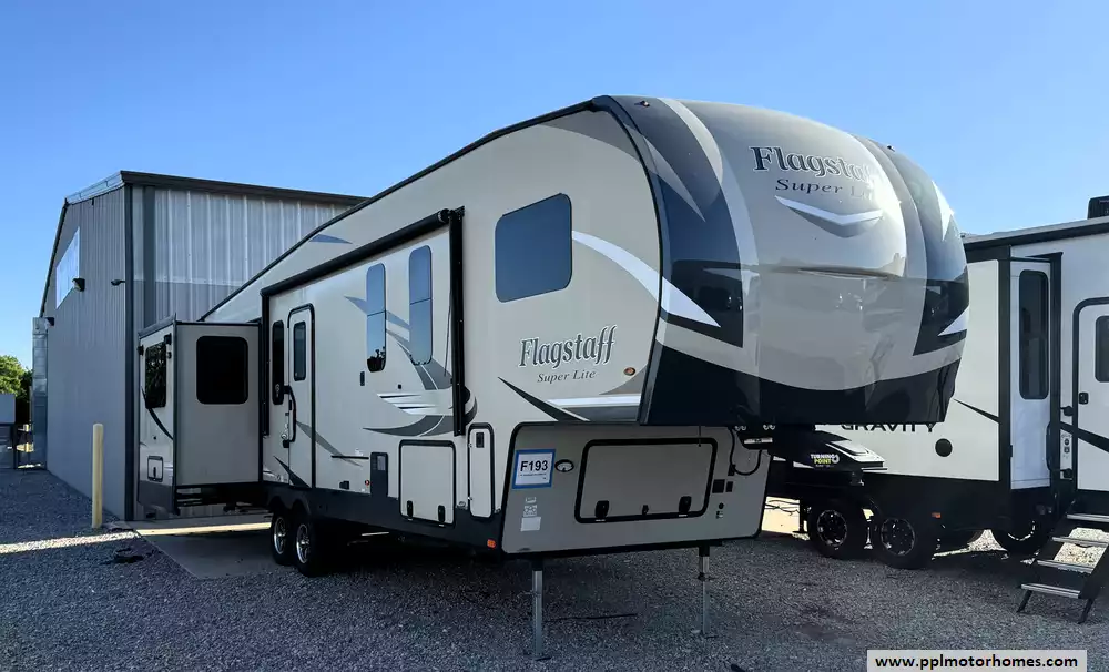 This 2020 Flagstaff Super Lite 529MBS has an Electric Landing Gear, 4 Slide-outs, 1 Ducted Air Conditioner, Double Door Gas/110v Dometic Refrigerator, Automatic Main Awning, Heated Tanks, Outside Speakers, TV, DVD Player, Outside Shower, Fireplace, Microwave, 3 Burner Range, Oven and sleeps up to 10