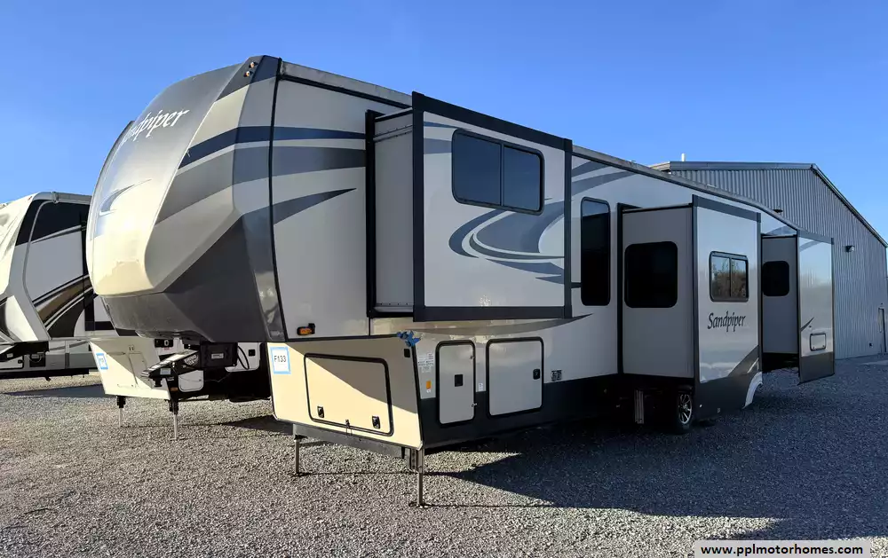 The 2020 Forest River Sandpiper 38FKOK is a luxurious 41-foot fifth wheel built for ultimate comfort and convenience. With six slide-outs, hydraulic landing gear, and dual ducted air conditioners, it offers generous living space and climate control for extended travels or full-time living. The kitchen is equipped with premium appliances, including a Furrion gas cooktop and oven, an LG residential refrigerator with ice maker, and an LG microwave with advanced features, making meal preparation effortless. Outside, a fully equipped kitchen, grill, and shower expand your living space into the outdoors.