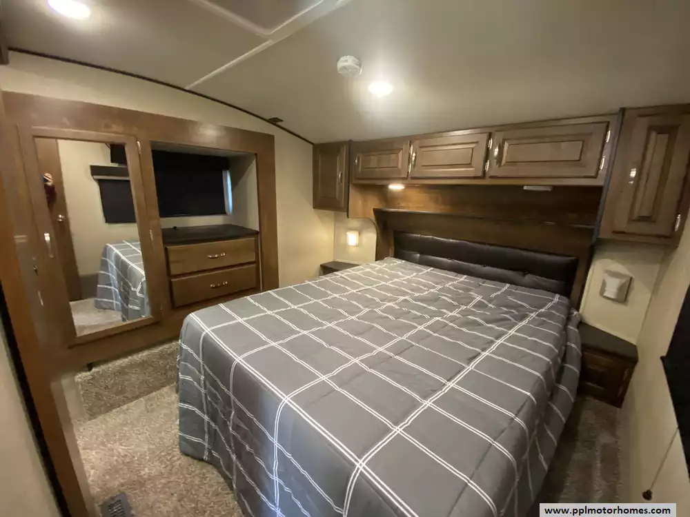 This 2020 Reflection 303RLS has a Hydraulic Landing Gear, 3 Slide-outs, 1 Ducted Air Conditioner, 4 Door Gas/12v Dometic Refrigerator, Automatic Main Awning, Washer/Dryer, Outside Speakers, 2 TVs, DVD Player, Outside Shower, Fireplace, Convection Microwave, 3 Burner Range, Oven