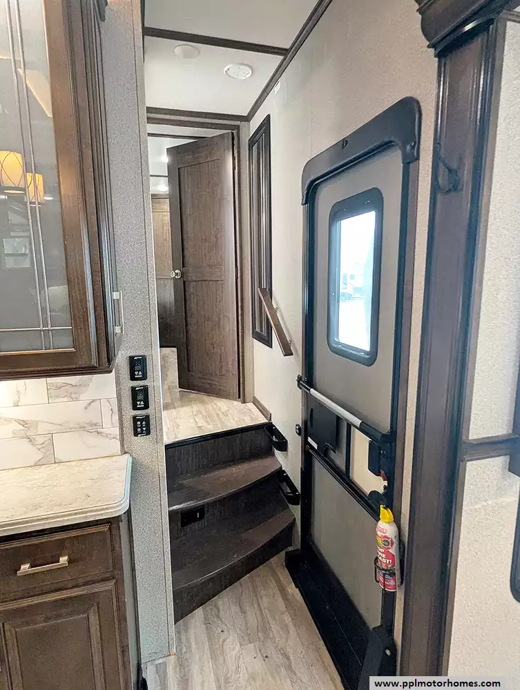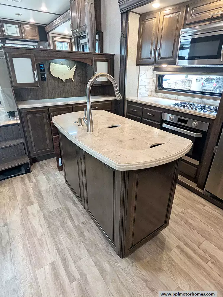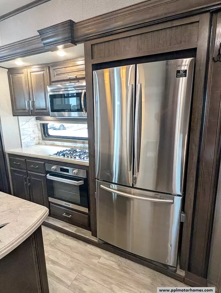 Inside, the Solitude lives up to its reputation as a gold standard for extended stays with a gourmet kitchen featuring a residential Samsung refrigerator with an in-fridge ice maker, a convection microwave, a three-burner range, and a full oven. The master suite and separate rear den offer a sophisticated retreat with two TVs and a cozy fireplace, all kept perfectly comfortable by three ducted air conditioners. This unit is fully equipped for ultimate convenience and self-sufficiency, boasting a factory-installed solar panel, a satellite receiver, a built-in washer and dryer, and a central vacuum system. Whether you are living full-time or taking an extended vacation, this Solitude offers the perfect blend of elegant finishes and rugged functionality.