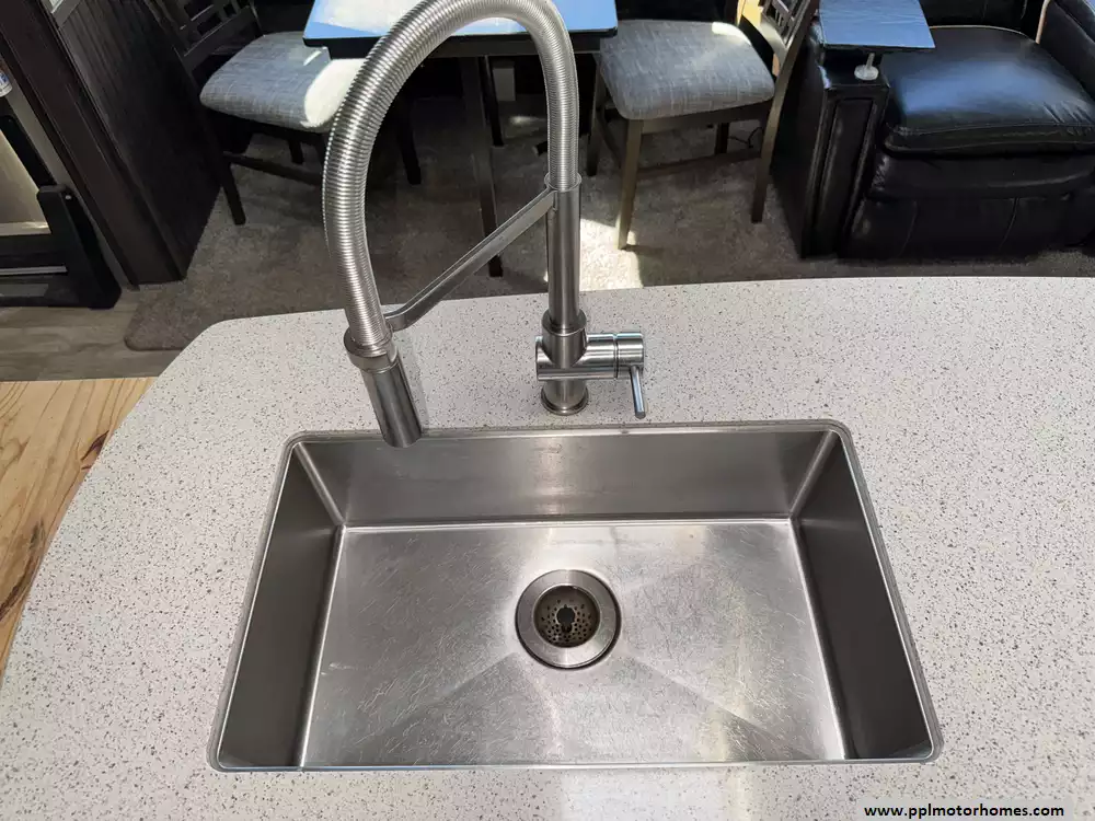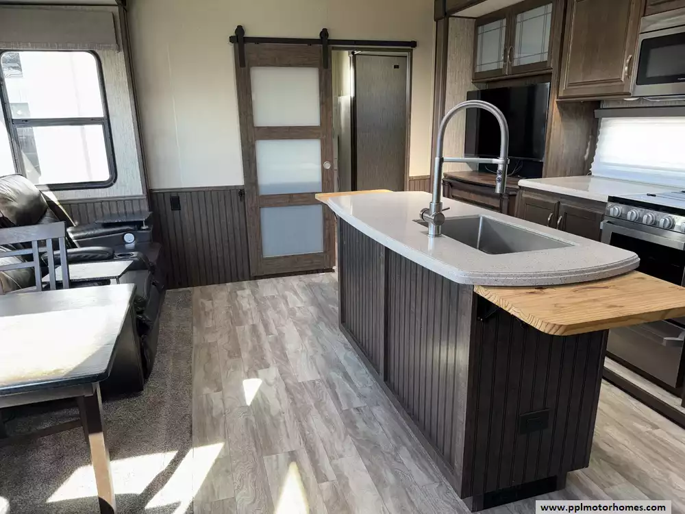 This 2020 Solitude S-Class 3740BH has an Electric Landing Gear, 4 Slide-outs, 2 Ducted Air Conditioners, 4 Door Side by Side Gas/12v Norcold Refrigerator, Washer/Dryer, Heated Tanks, Outside Speakers, TV, Outside Shower, Fireplace, Convection Microwave, 3 Burner Range, Oven