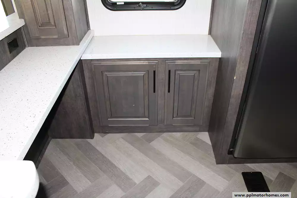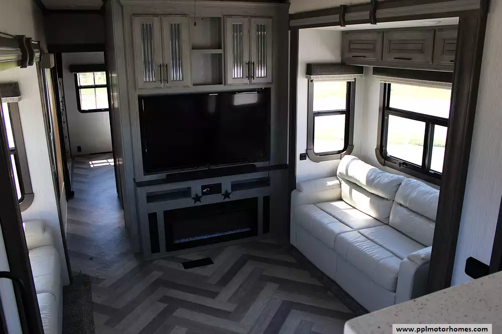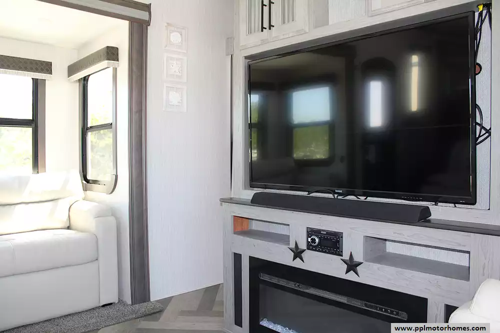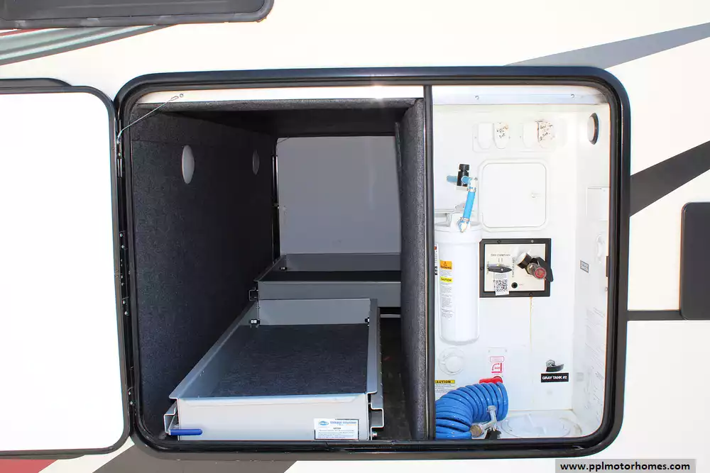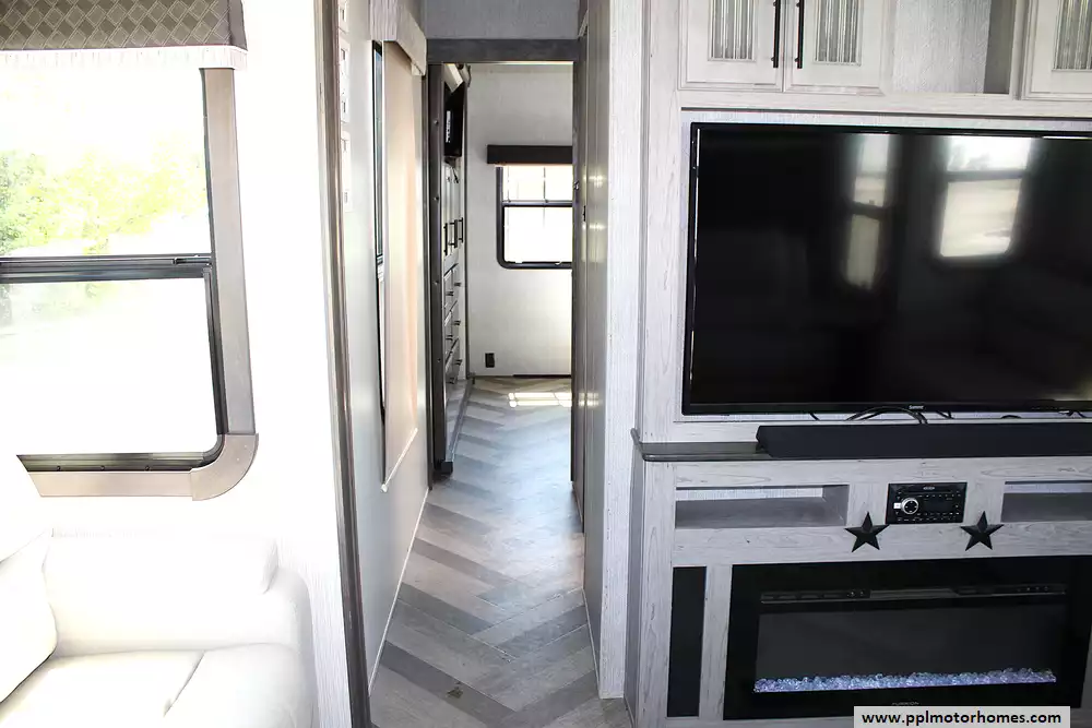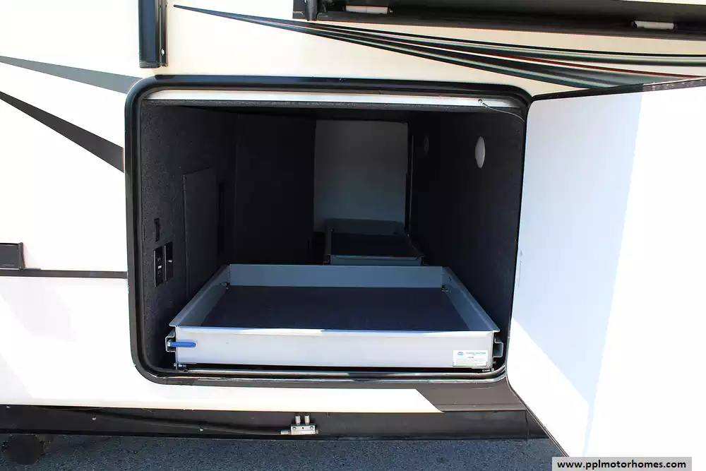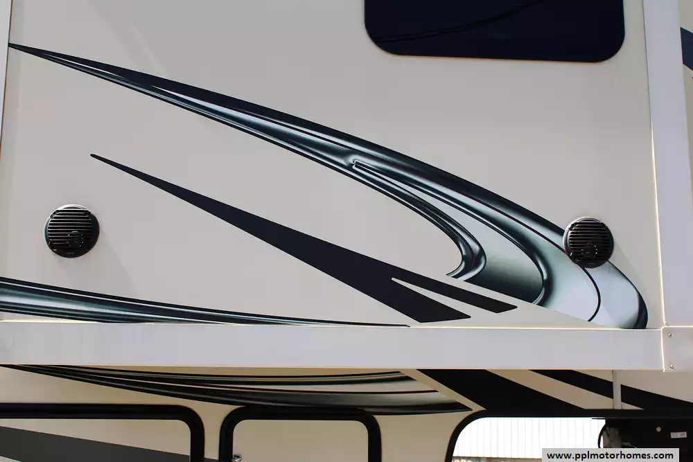 This unit is loaded with premium upgrades that elevate both comfort and functionality. Travel confidently with a complete Furrion camera system including rear, side, and entry-door cameras for superior visibility when maneuvering. Towing is smoother thanks to the Flex Air air-bag hitch, while MORryde slide-out awning toppers help protect your slide rooms from debris and weather. Storage is equally impressive with cargo bay slider trays, making it easy to access gear without crawling into compartments. When it's time to relax, the bedroom features a Sleep Number California King mattress, delivering adjustable comfort that rivals home.