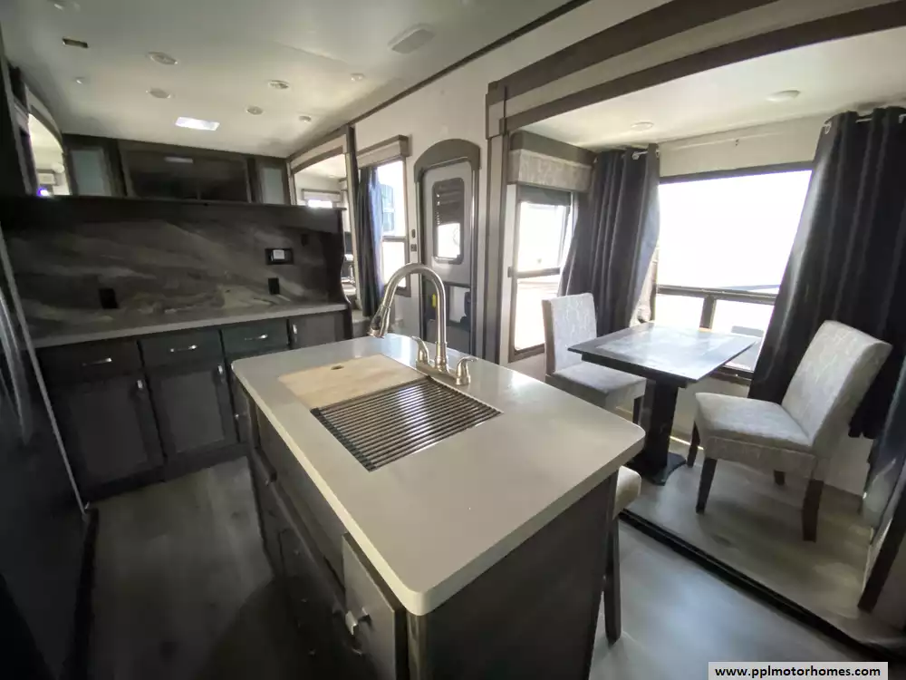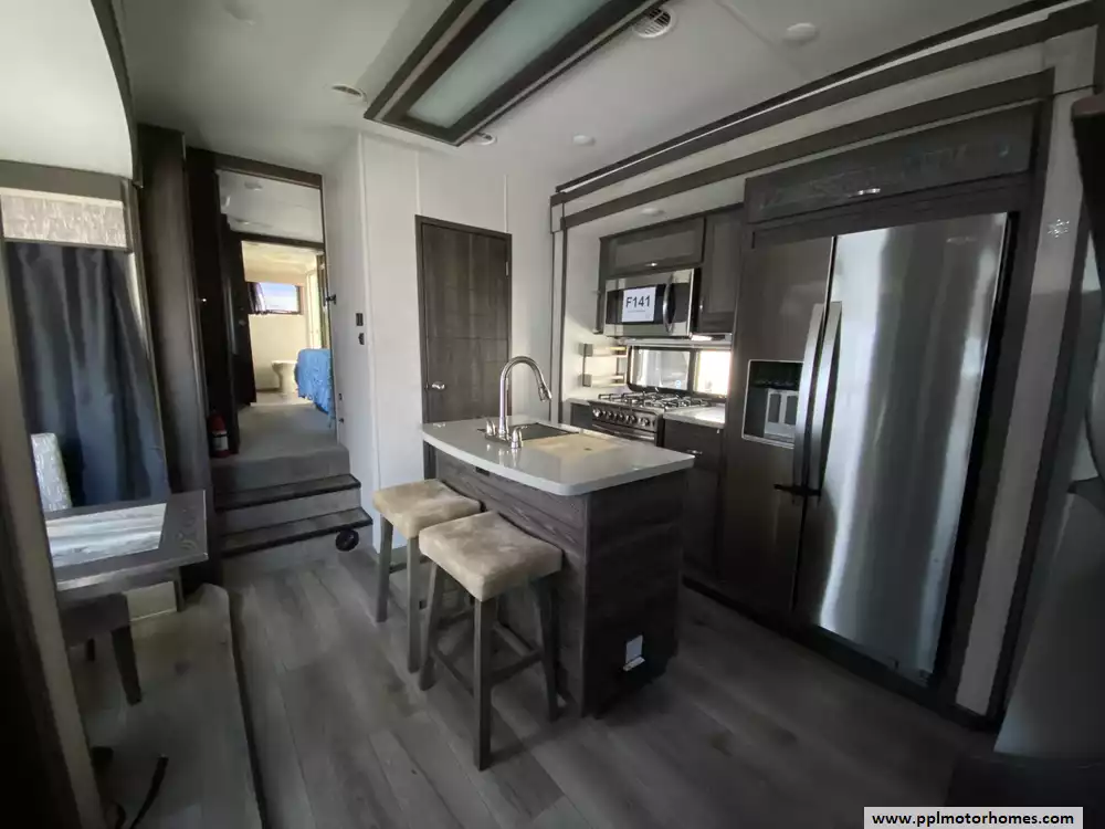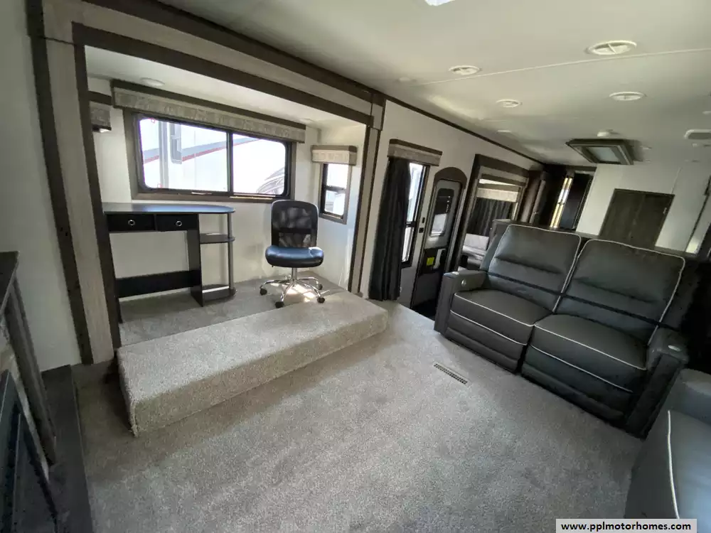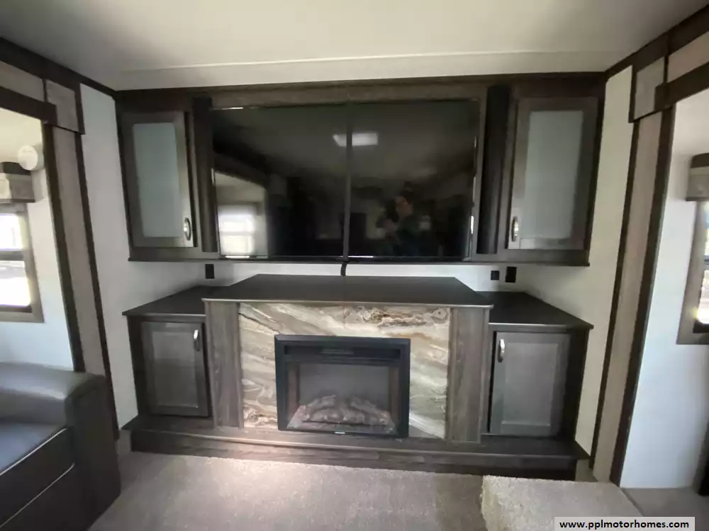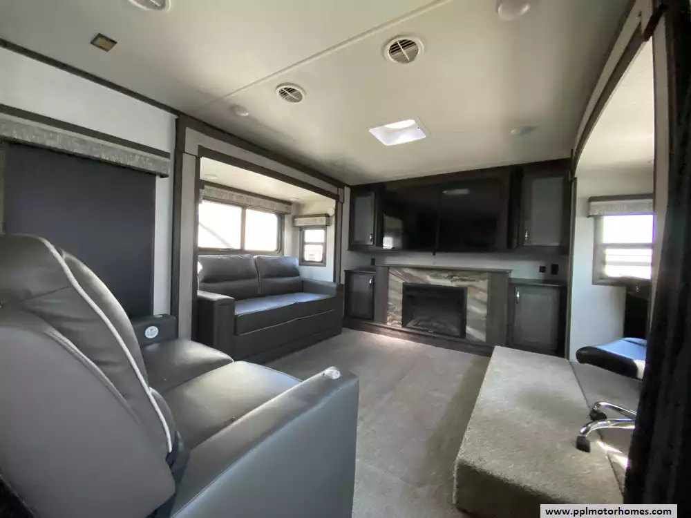 Experience the pinnacle of luxury and space with this 2020 Open Range 373RBS, a 43-foot fifth wheel designed for those who refuse to compromise on residential comfort. Renowned for its industry-leading wide-body construction and massive interior volume, this model features five spacious slide-outs that create an expansive floor plan perfect for entertaining or long-term living. The chef-inspired kitchen is a standout, boasting a double-door 110v residential Whirlpool refrigerator with an in-fridge ice maker, a four-burner range, oven, and microwave. Whether you are relaxing by the cozy interior fireplace or enjoying the outdoors under the automatic main awning, this coach delivers a premium experience. The exterior is equally impressive, featuring a full outdoor kitchen, grill, and entertainment system, all protected by a durable TPO roof and kept cool by two ducted air conditioners.