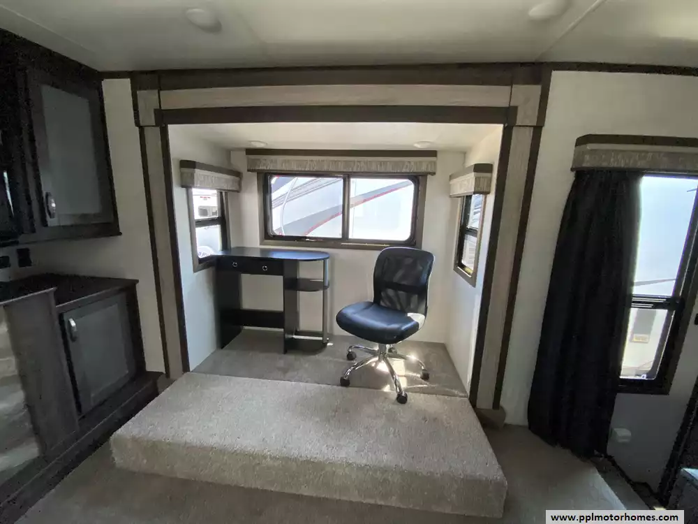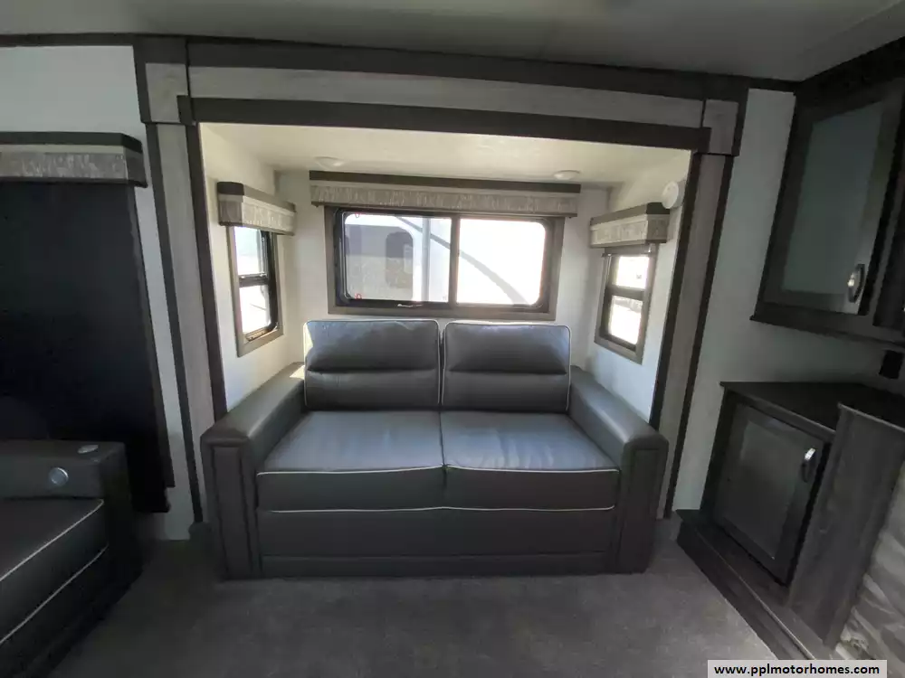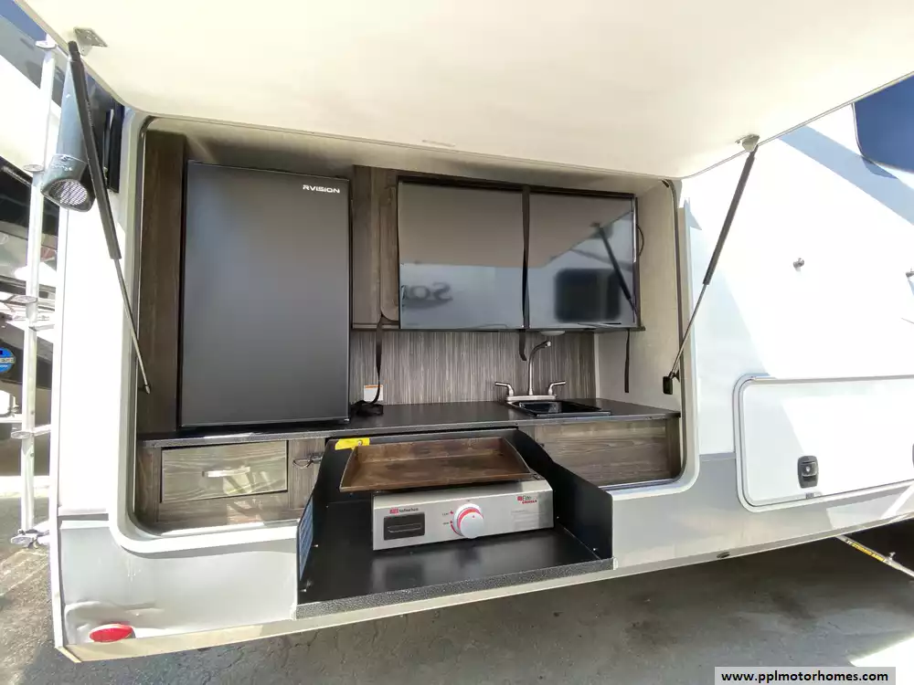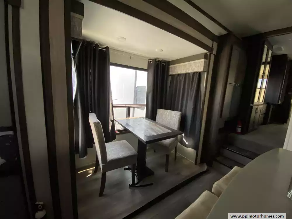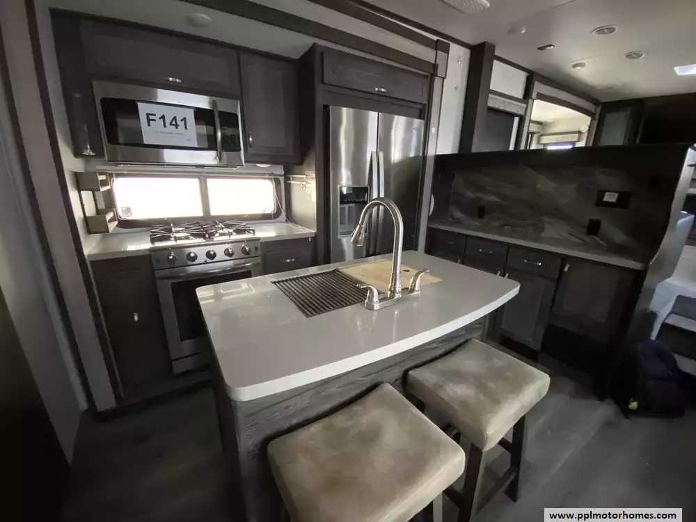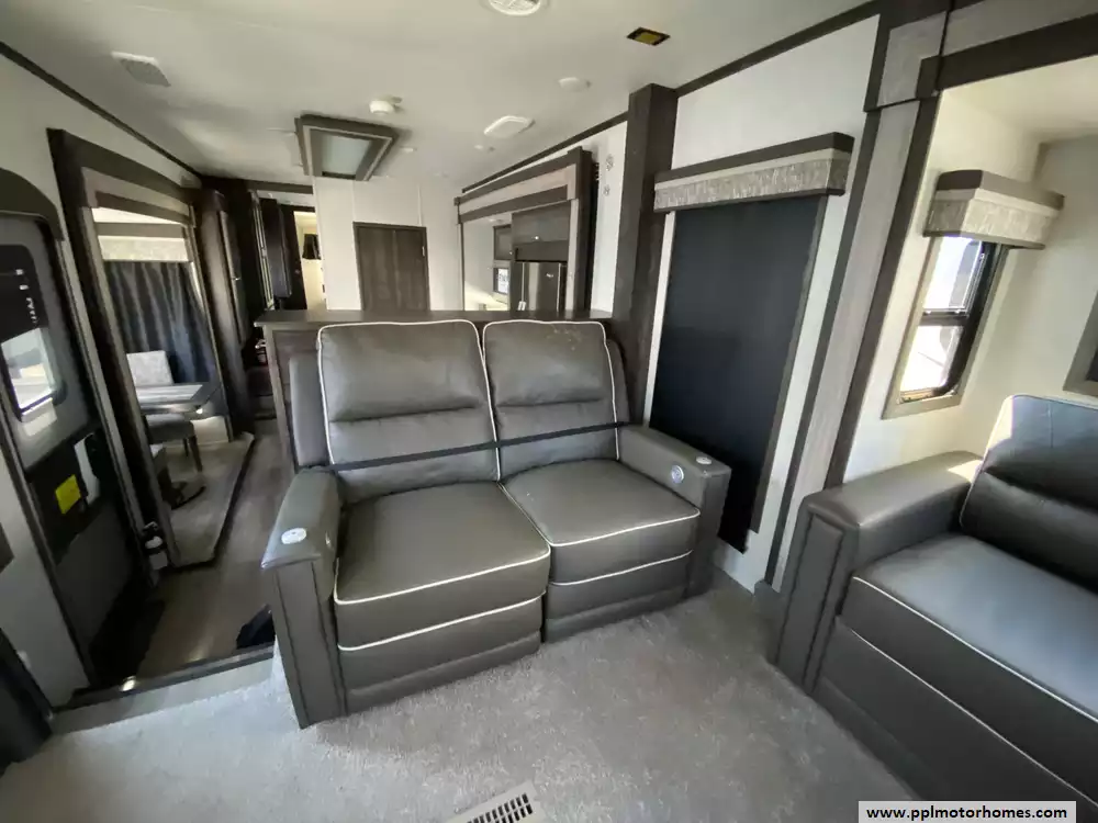 Experience the pinnacle of luxury and space with this 2020 Open Range 373RBS, a 43-foot fifth wheel designed for those who refuse to compromise on residential comfort. Renowned for its industry-leading wide-body construction and massive interior volume, this model features five spacious slide-outs that create an expansive floor plan perfect for entertaining or long-term living. The chef-inspired kitchen is a standout, boasting a double-door 110v residential Whirlpool refrigerator with an in-fridge ice maker, a four-burner range, oven, and microwave. Whether you are relaxing by the cozy interior fireplace or enjoying the outdoors under the automatic main awning, this coach delivers a premium experience. The exterior is equally impressive, featuring a full outdoor kitchen, grill, and entertainment system, all protected by a durable TPO roof and kept cool by two ducted air conditioners.