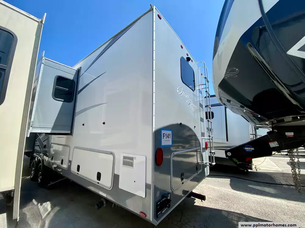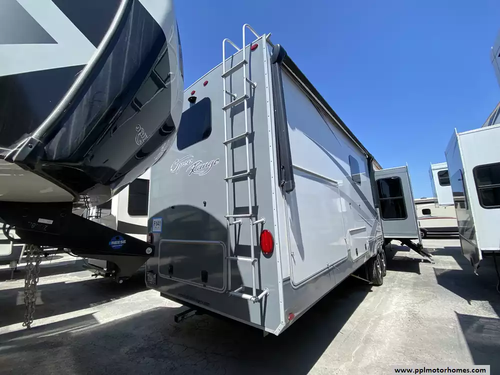 Setting up camp is effortless with the electric landing gear, leaving you more time to enjoy the many high-end amenities this Open Range offers. The interior living area is equipped with a TV and DVD player, while the convenient washer/dryer connections and outside shower add a level of practicality for any journey. Known for its exceptional rear bath suite and superior storage capacity, this 373RBS provides a private, spa-like retreat at the end of the day. This fifth wheel perfectly combines Open Range's reputation for innovative, spacious design with all the comforts of a modern home, making it an ideal choice for discerning travelers seeking a true home-on-wheels.