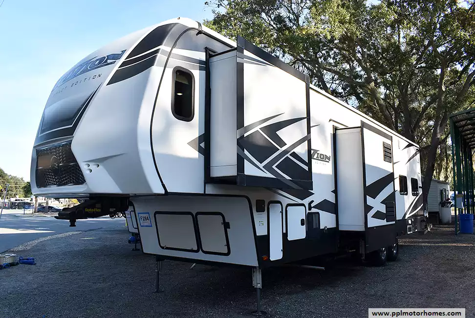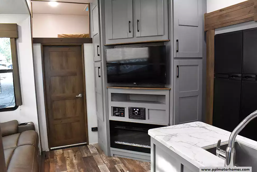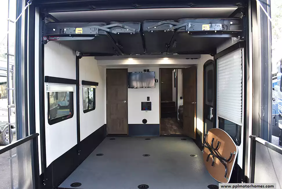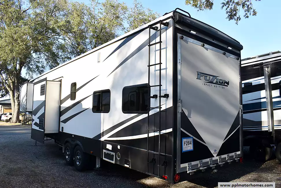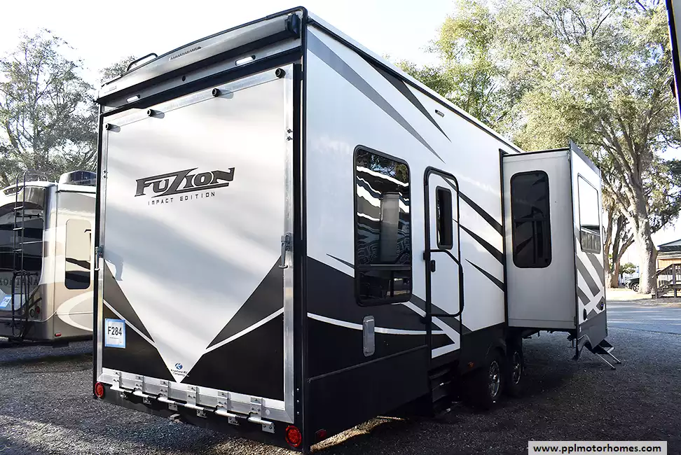 This 2020 Fuzion Impact 367 has a Hydraulic Landing Gear, 3 Slide-outs, Onan Gas Generator, 2 Ducted Air Conditioners, 4 Door Gas/12v Norcold Refrigerator, Automatic Main Awning, Washer/Dryer Connections, Outside Speakers, 2 TVs, DVD Player, Outside Shower, Fireplace, Microwave, 3 Burner Range, Oven
