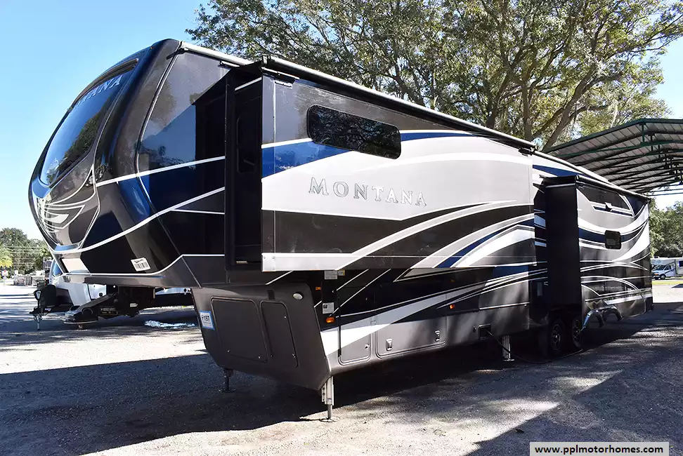 This 2020 Montana Legacy Edition 3811MS has a Hydraulic Landing Gear, 3 Slide-outs, 3 Ducted Air Conditioners, Residential Samsung Refrigerator, In-Fridge Ice Maker, Automatic Main Awning And Slide Awning, Washer/Dryer Connections, Solar Panel, Heated Tanks, Outside Speakers, 2 TVs, DVD Player, Outside Shower, Fireplace, Central Vacuum, Convection Microwave, 3 Burner Range, Oven
