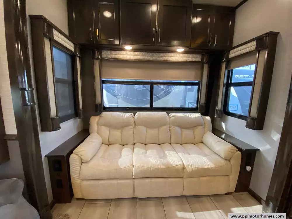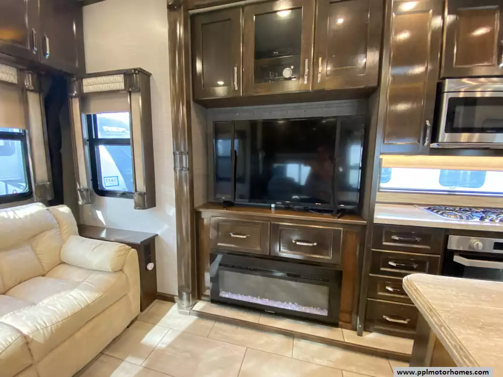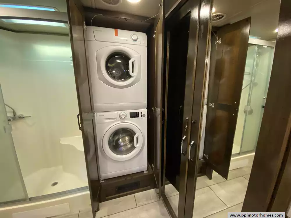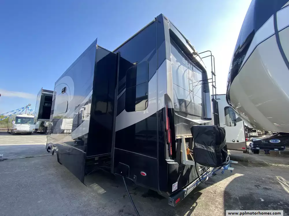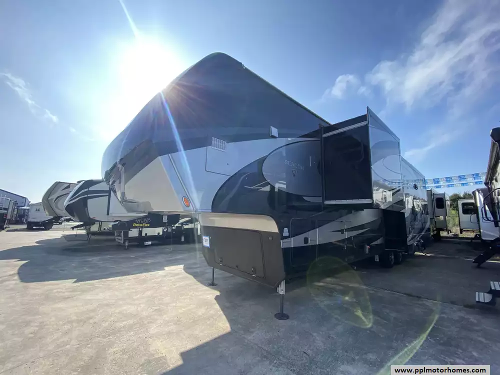 This 2020 Beacon 39GBB Full Body Paint has a Hydraulic Landing Gear, 4 Slide-outs, 2 Ducted Air Conditioners, an One Minie Split A/C @ rear of unit, Double Door Residential Whirlpool Refrigerator, In-Fridge Ice Maker,Wire racks Refrigerator, Two Automatic Main Awning, Washer/Dryer, Heated Tanks, Satellite Dish & Receiver, Outside Speakers, 2 TVs, DVD Player, Outside Shower, Fireplace, Central Vacuum, Convection Microwave, 3 Burner Range, Oven, Electric Black and Grey Valves